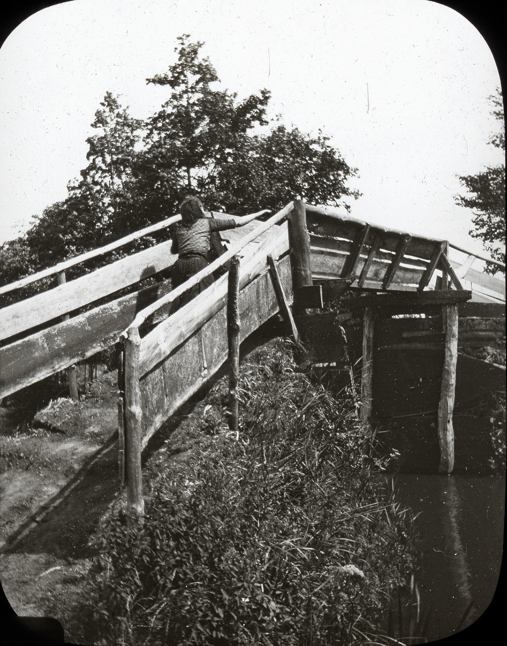 Meisje op een houten brug in Giethoorn. De opname is waarschijnlijk gemaakt omstreeks 1900.