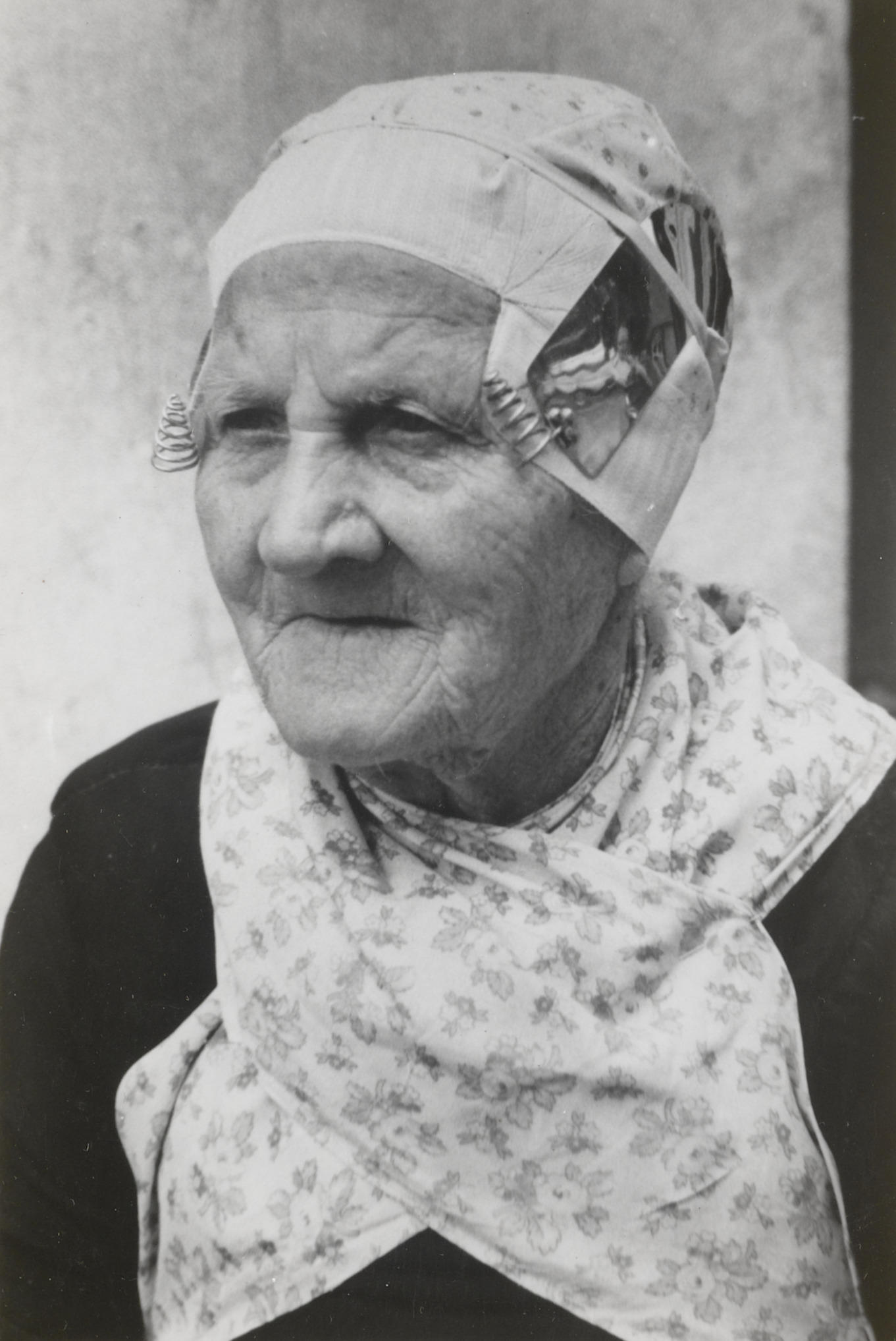 Vrouw uit Hierden, gekleed in de streekdracht van de Noordwest-Veluwe. De vrouw is gekleed in opknapdracht. De zogenoemde tipmuts, de gedessineerde ondermuts, is rondom afgezet met langetband. Over de tipmuts draagt ze een smal zilveren oorijzer met gouden krullen aan beide uiteinden.