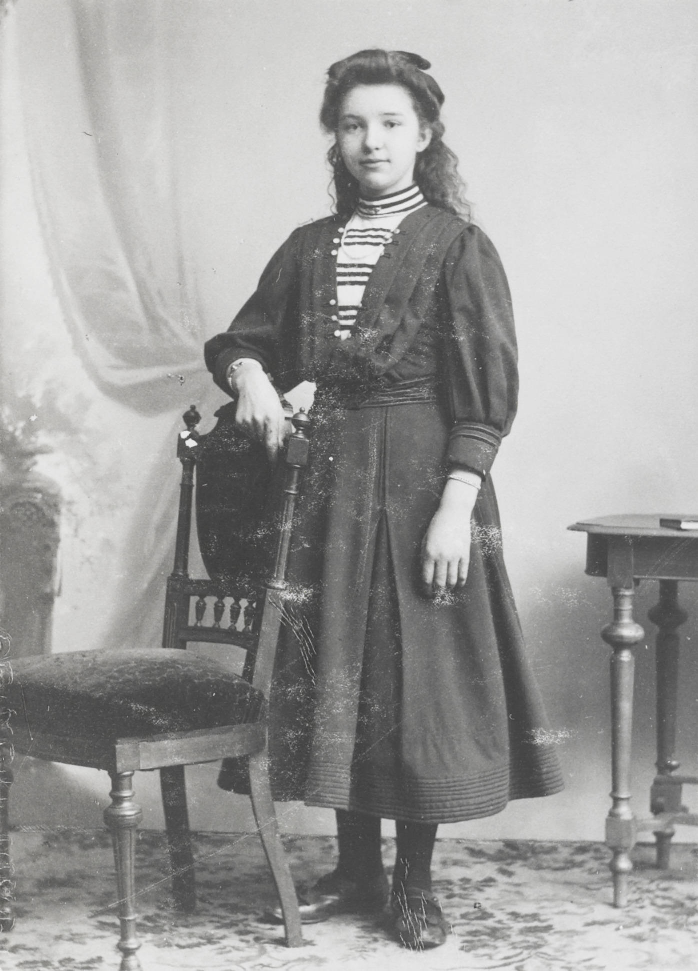 Annie Zwaan, gekleed in modedracht.