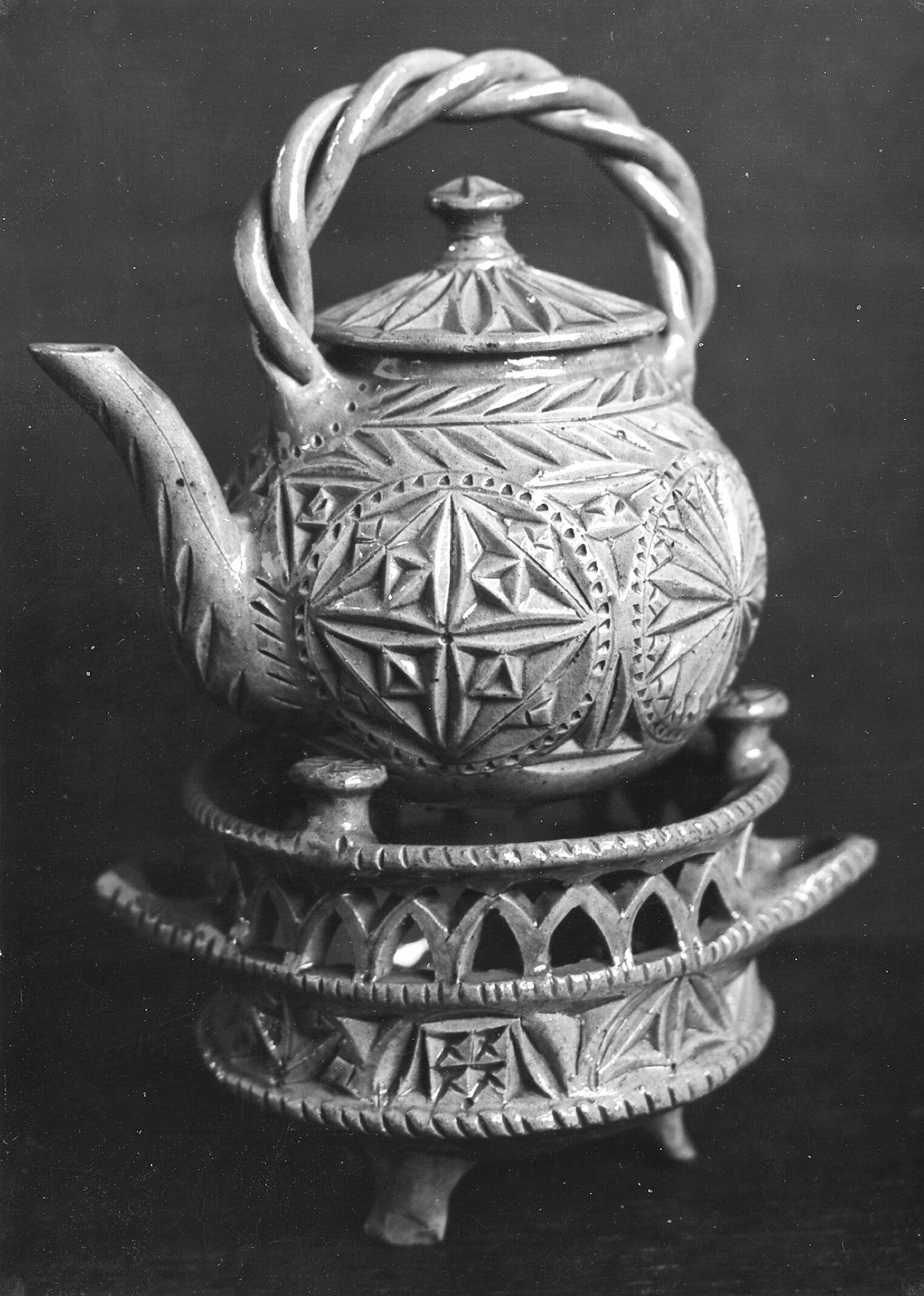 Een theepot op een komfoor, beide van zogenoemd Lemster kerfsneeaardewerk. Ze waren onderdeel van de verzameling van het Nederlands Openluchtmuseum. Tijdens de Tweede Wereldoorlog zijn de theepot en het komfoor verloren gegaan.