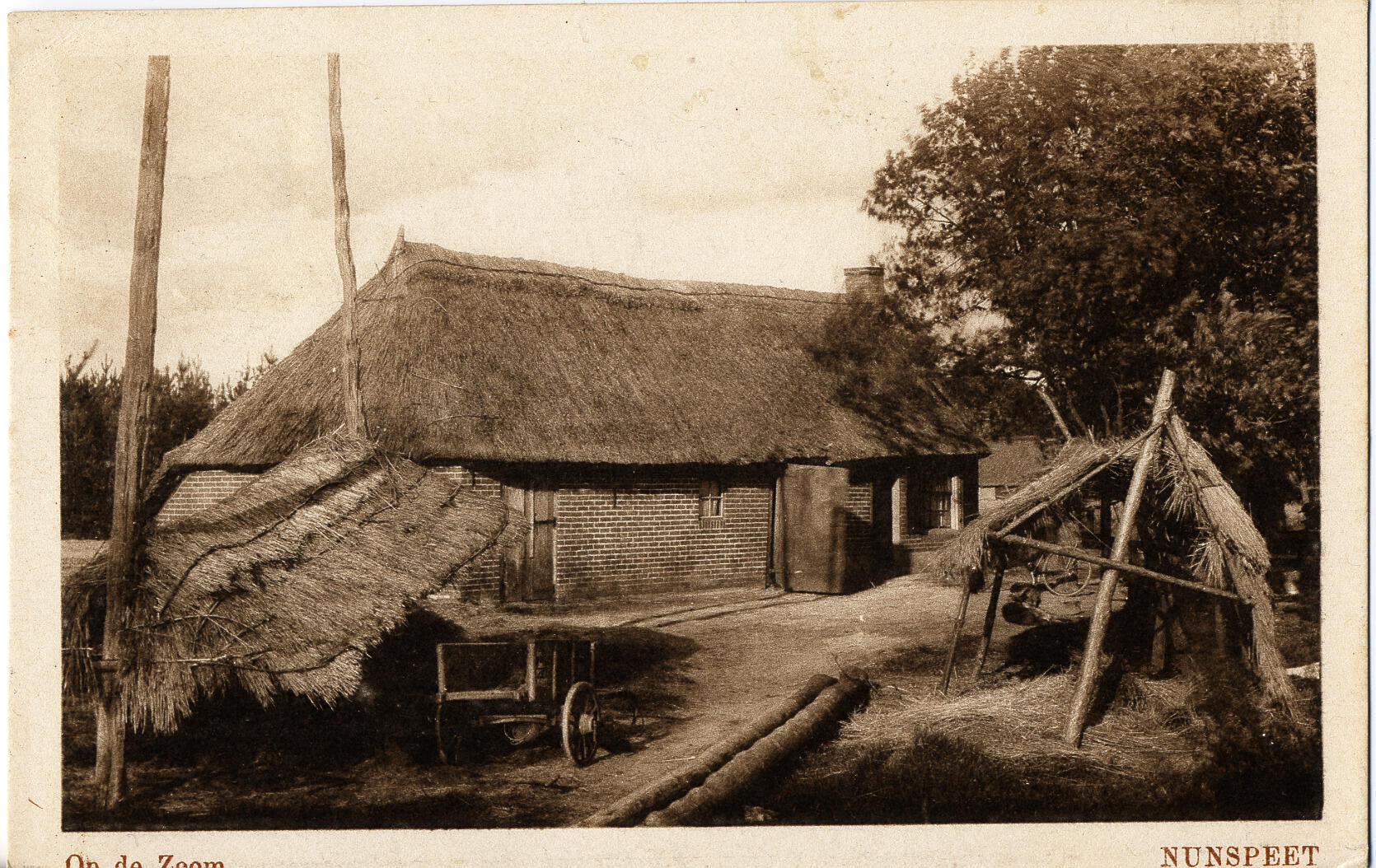 Prentbriefkaart van een keuterij of arbeiderswoning op de Zoom bij Nunspeet. Links staat een tweeroedige hooiberg.