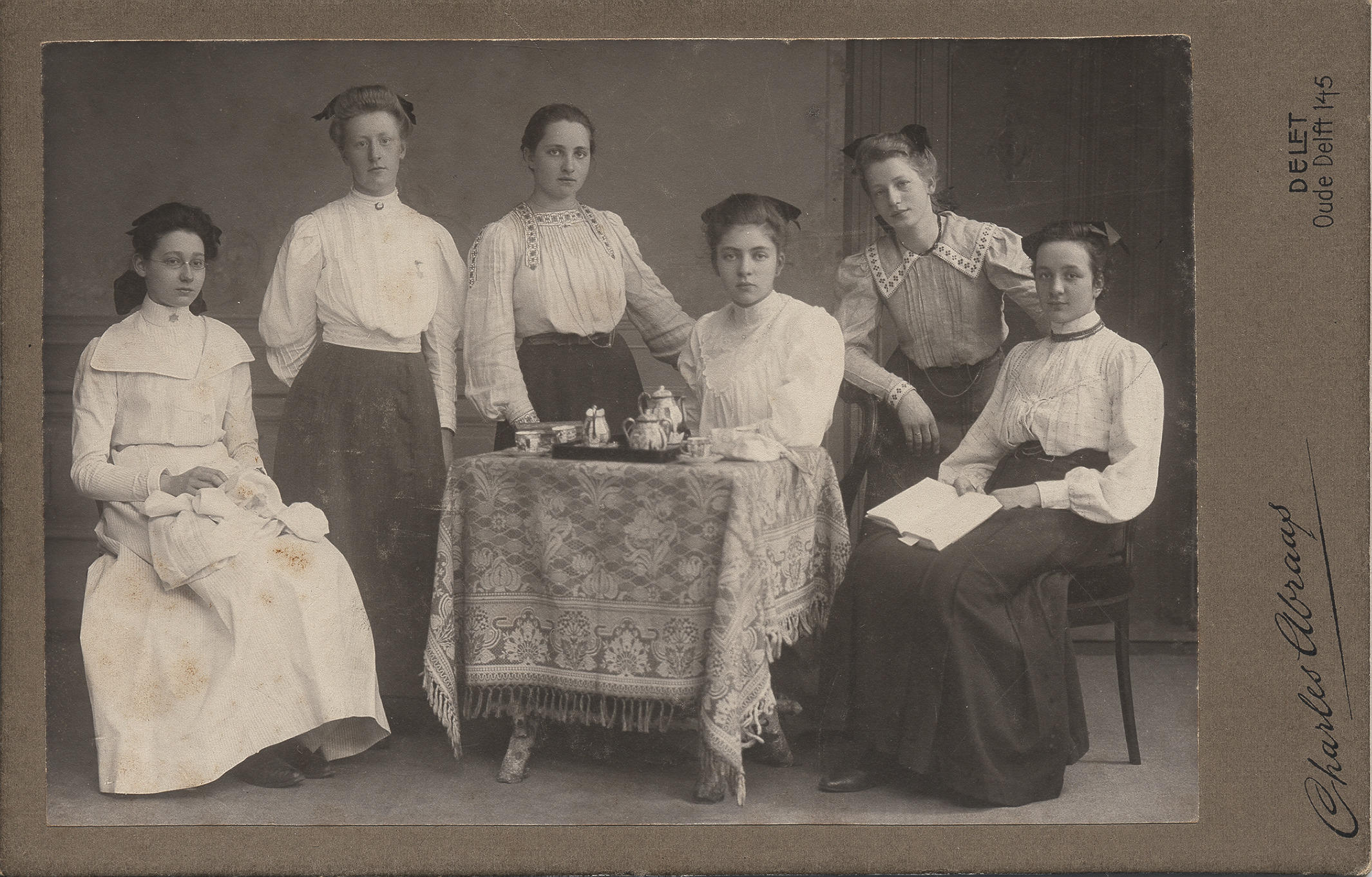 Zes jonge vrouwen in modedracht rondom een tafel met een theeservies. De linker vrouw heeft een handwerkje op schoot en de rechter vrouw een boek.