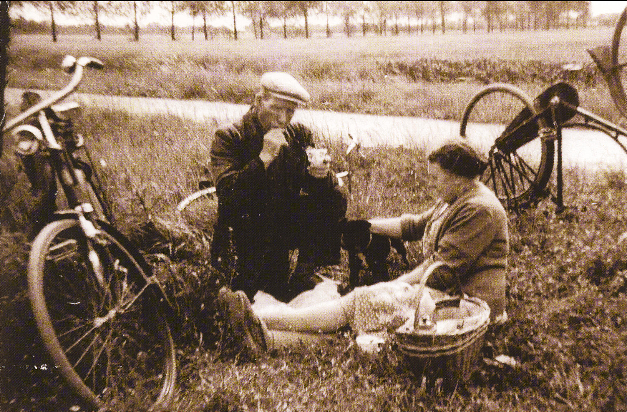 Piet van Hoogstraten en zijn vrouw Lies Bouman zittend in het gras, tussen twee fietsen. Naast Lies staat een mand. Tussen het echtpaar is een puppy te zien. De foto is genomen aan de Zeggelaarsweg in Alphen aan de Maas.