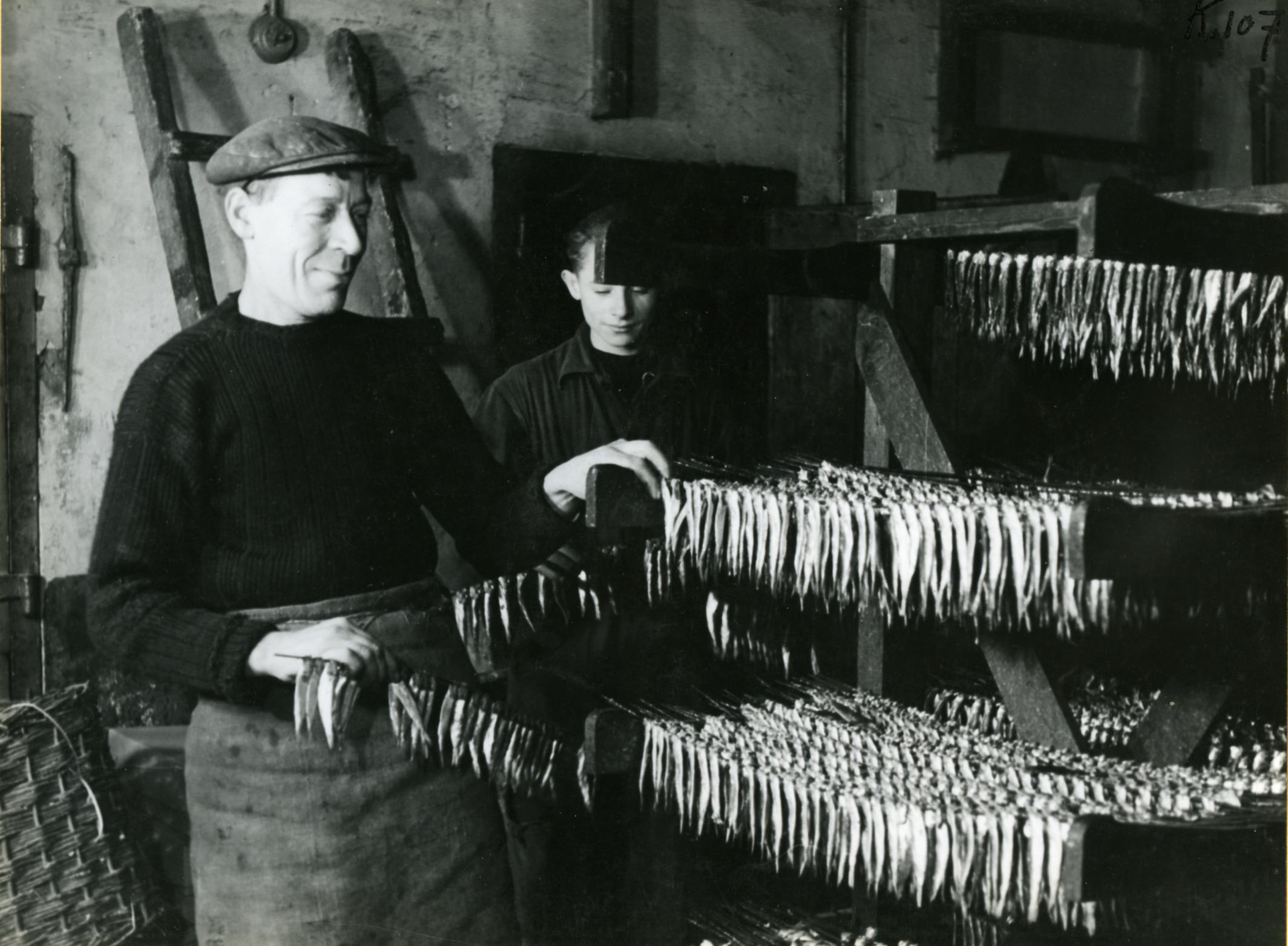 Een visrokerij in Katwijk aan Zee. De 'speten' worden op rekken gelegd, die vervolgens in de 'hank' (rookkast) geplaatst worden.