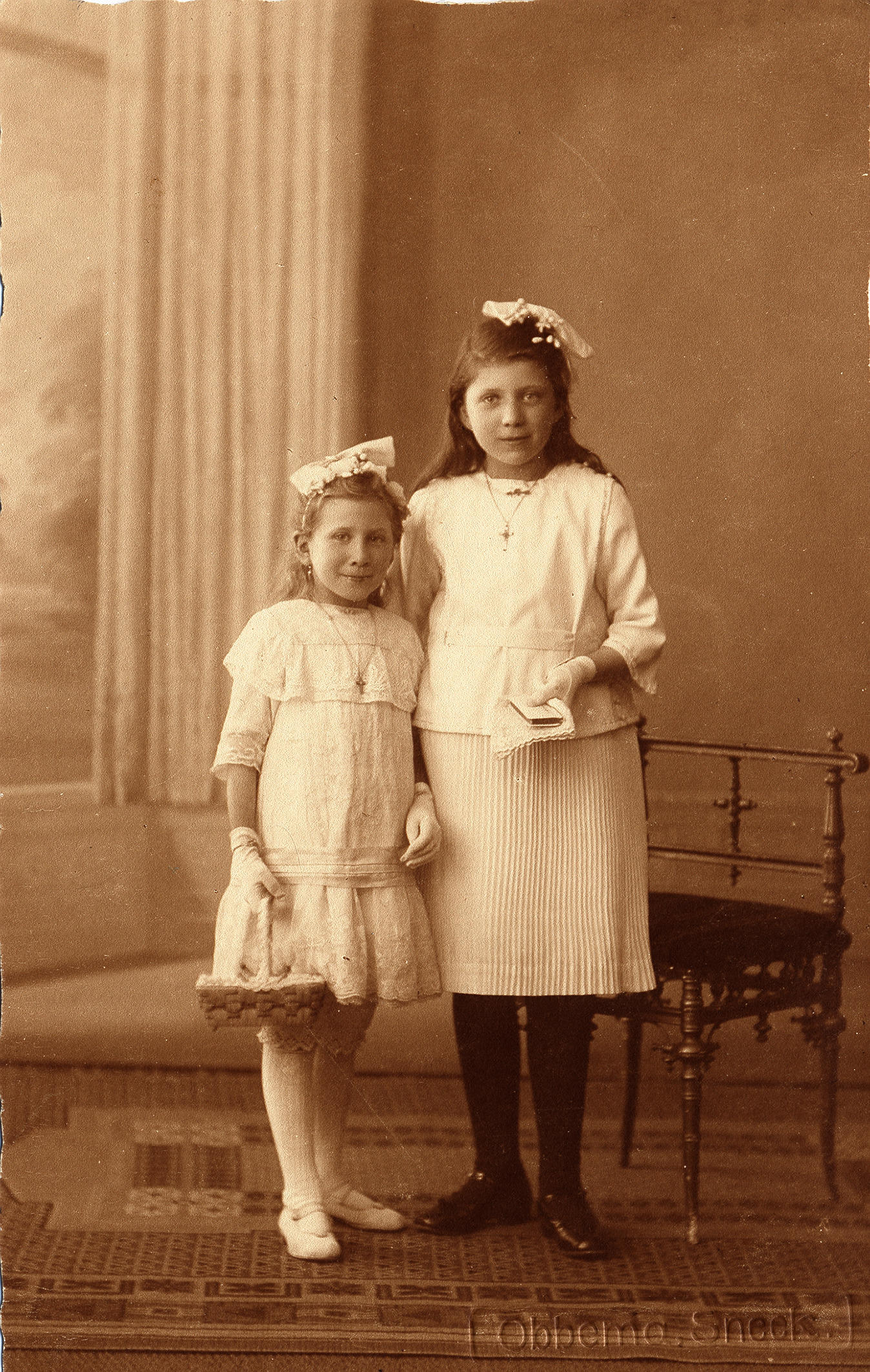Communicante (rechts) en processiebruidje (links). De jurk en het bloemenmandje van het processiebruidje zijn opgenomen in de collectie van het Nederlands Openluchtmuseum.