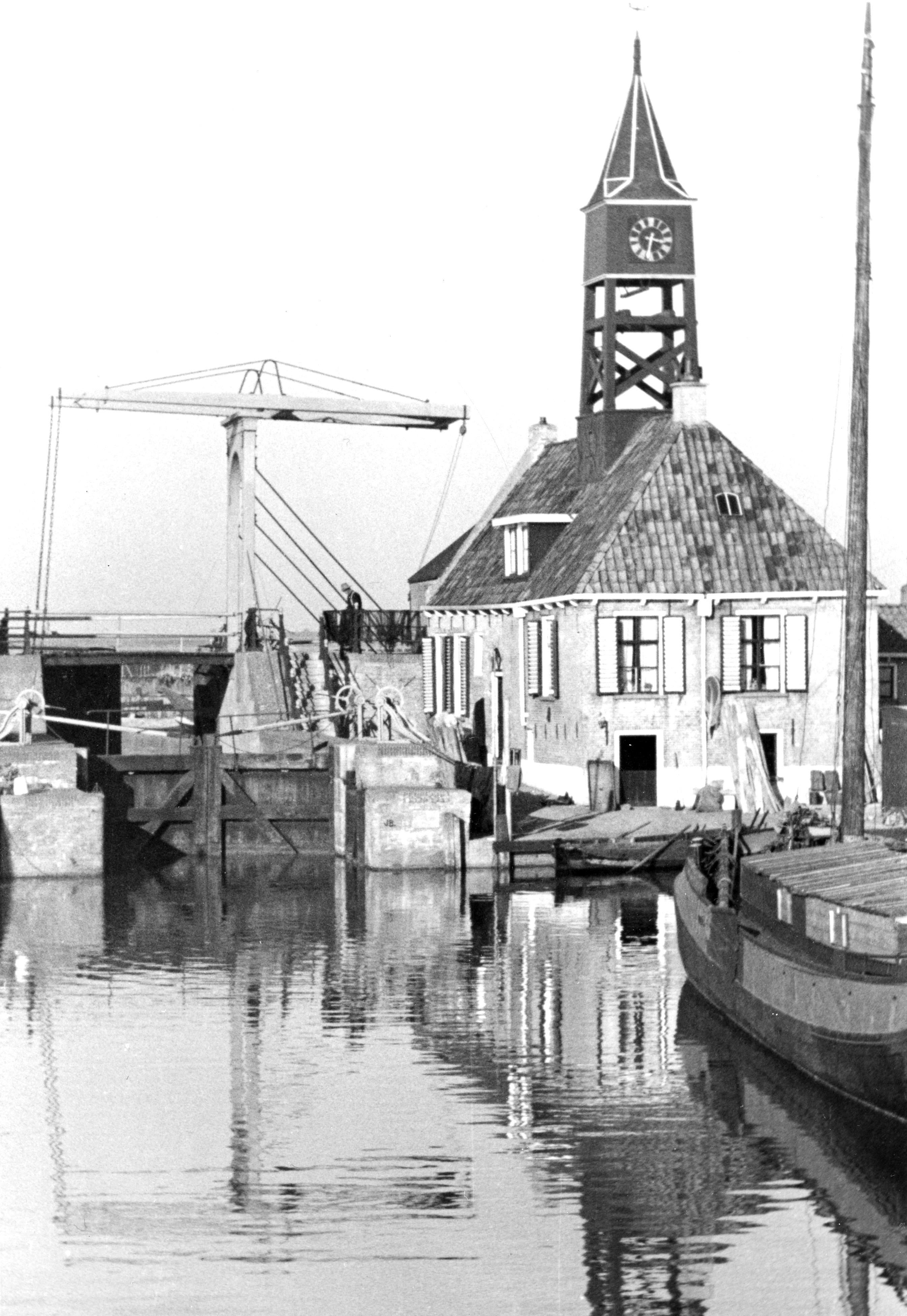 Sluis en sluiswachterswoning, Hindeloopen, 1943 (zwart-wit foto)