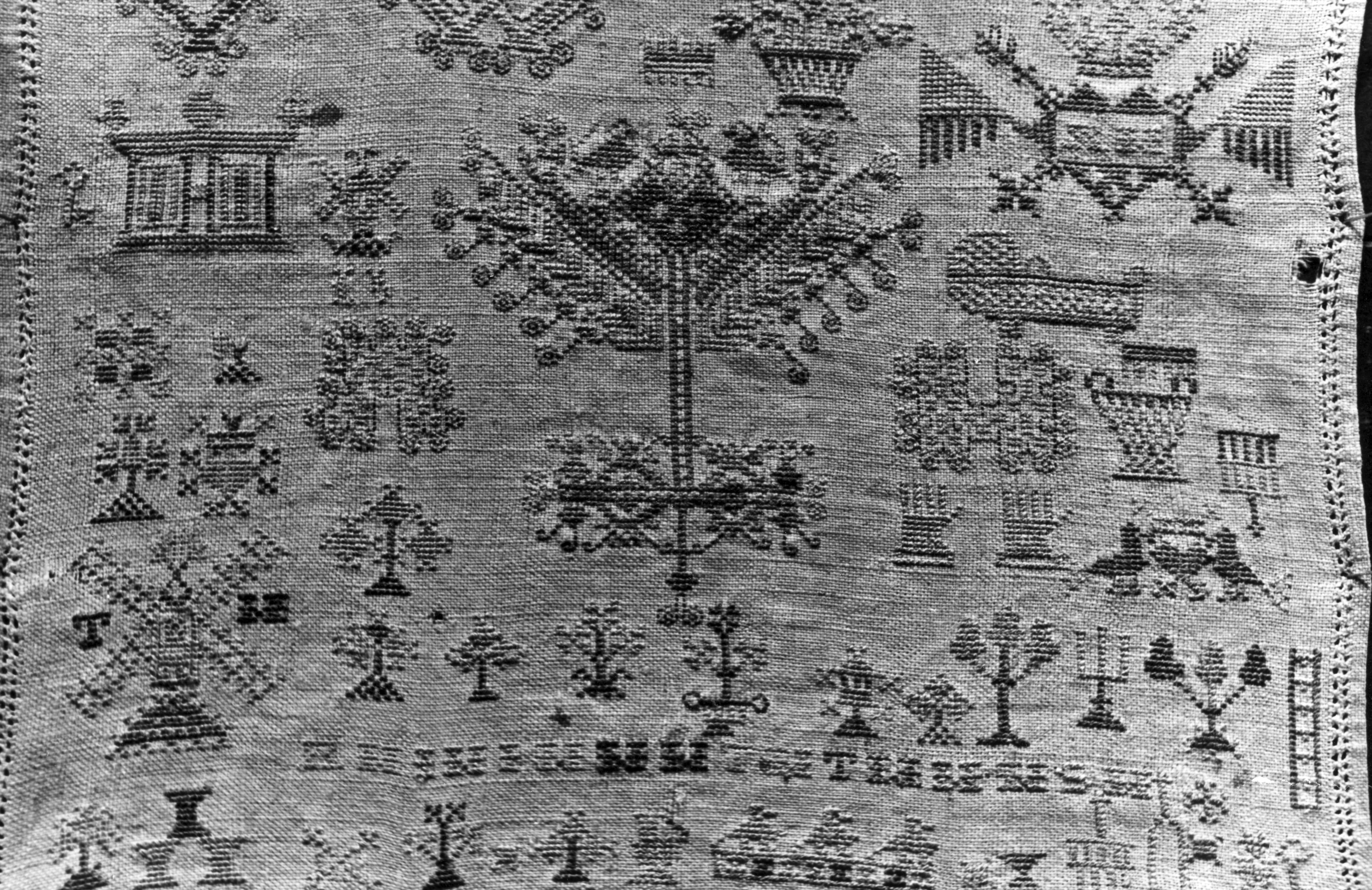 Detail van een merklap uit Hindeloopen, 1943 (zwart-wit foto)