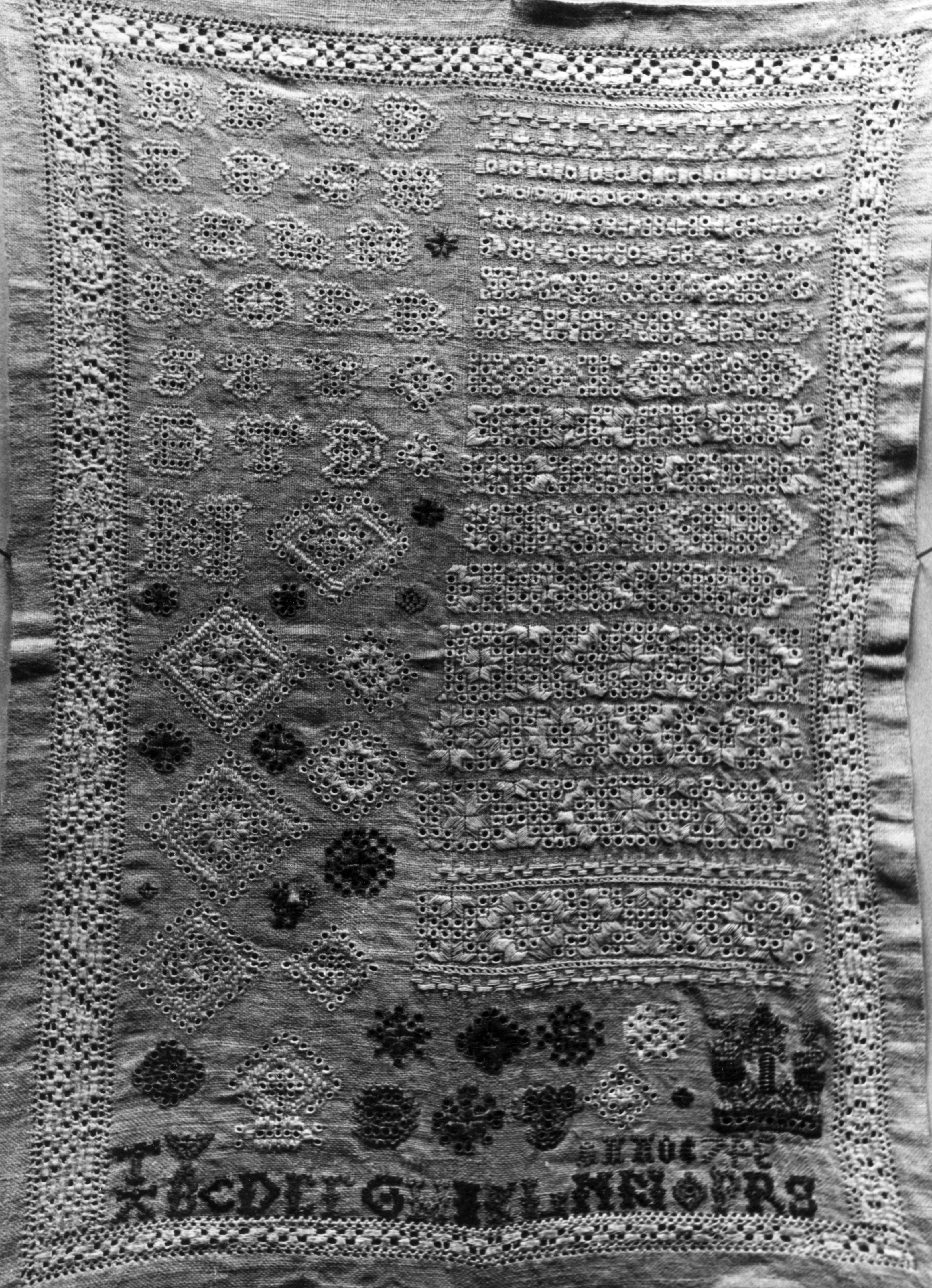 Lap uit 1743 met witwerk, snijwerk en stopwerk. De lap is eigendom van een familie in Hindeloopen.