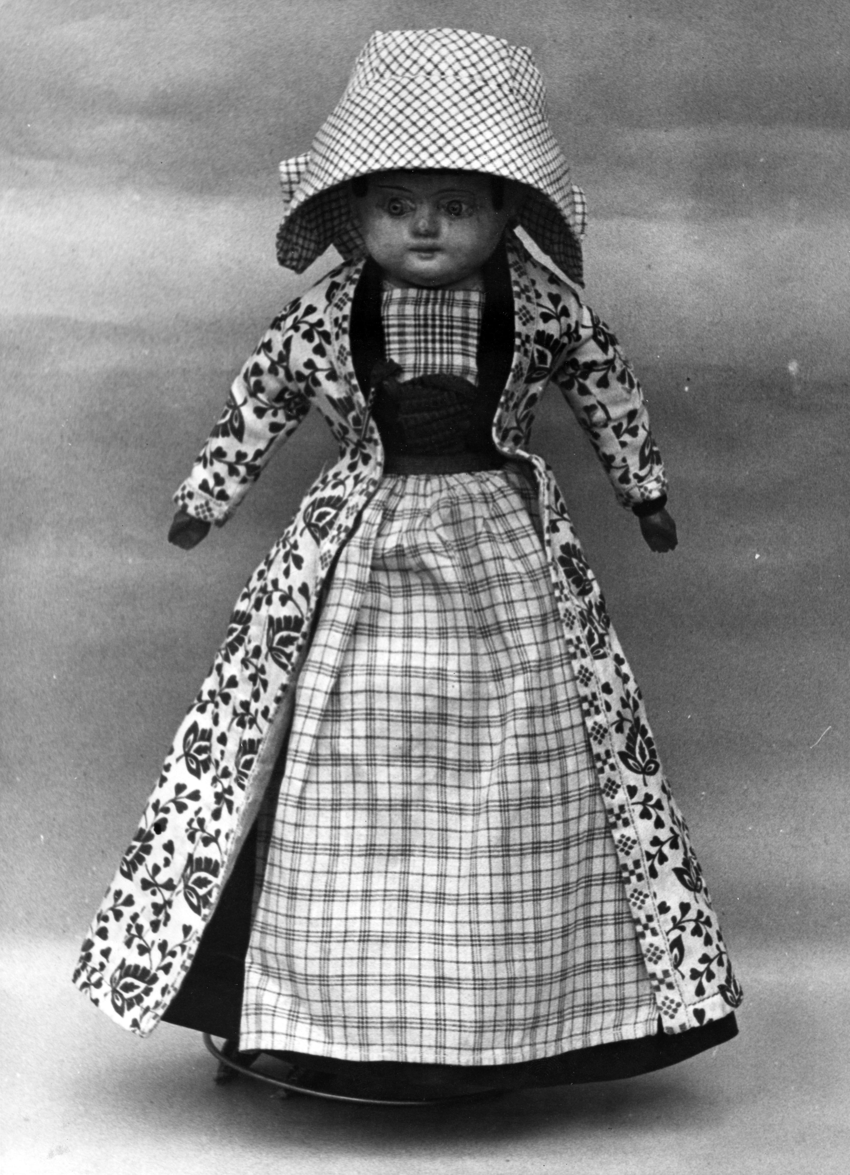 Pop in Hindelooper streekdracht. Ze is gekleed in de dracht van de ongehuwde vrouw. De pop is eigendom van een familie in Hindeloopen.