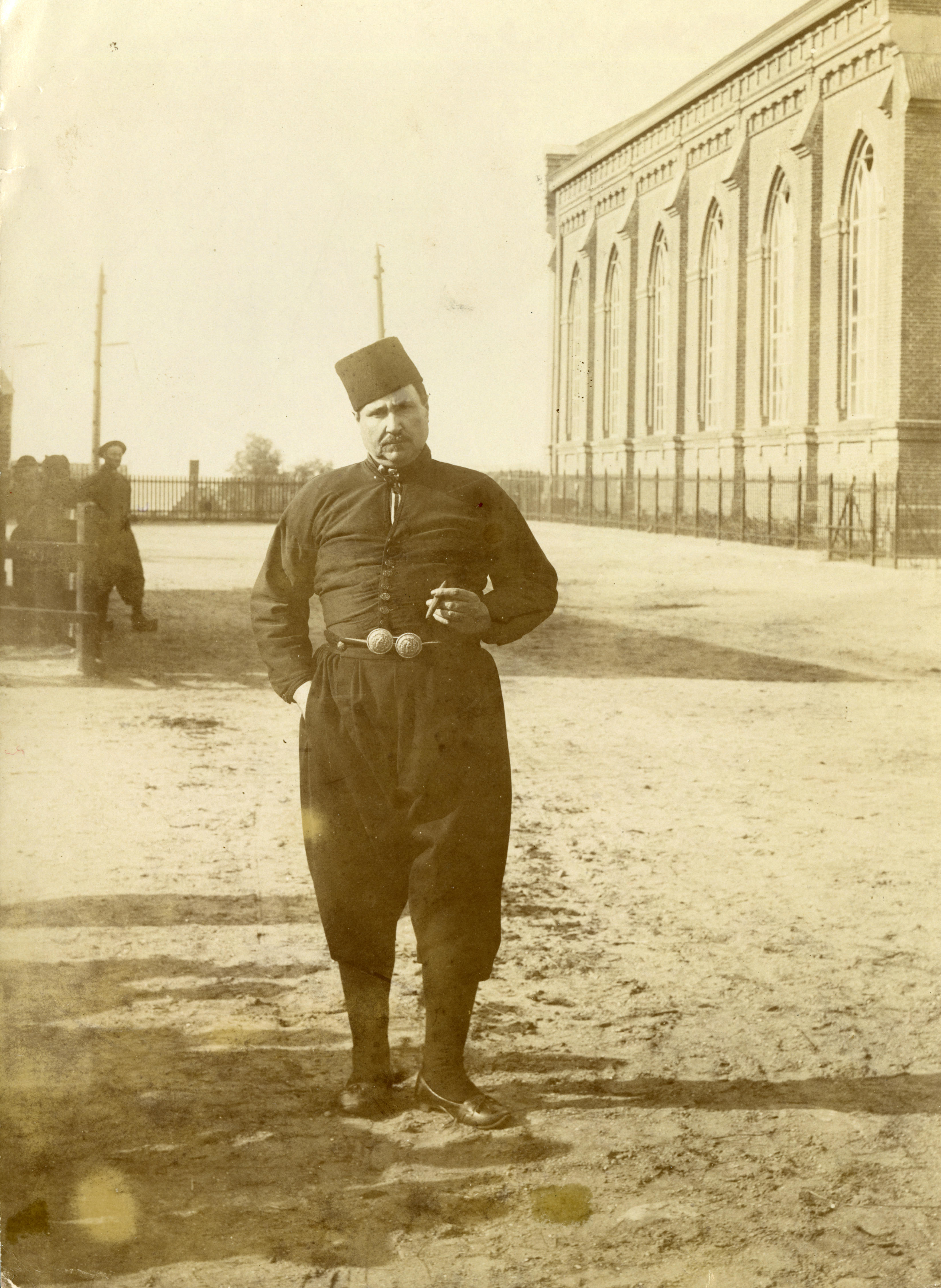 Man in Urker streekdracht bij de gereformeerde kerk op het eiland Urk. De man draagt een zogenoemd rökkie (zwart jasje) en heeft op het hoofd een 'karpoets'. Het opschrift op de achterzijde luidt: 'Transvaalsche boer in Urker costuum, ± 1910'.