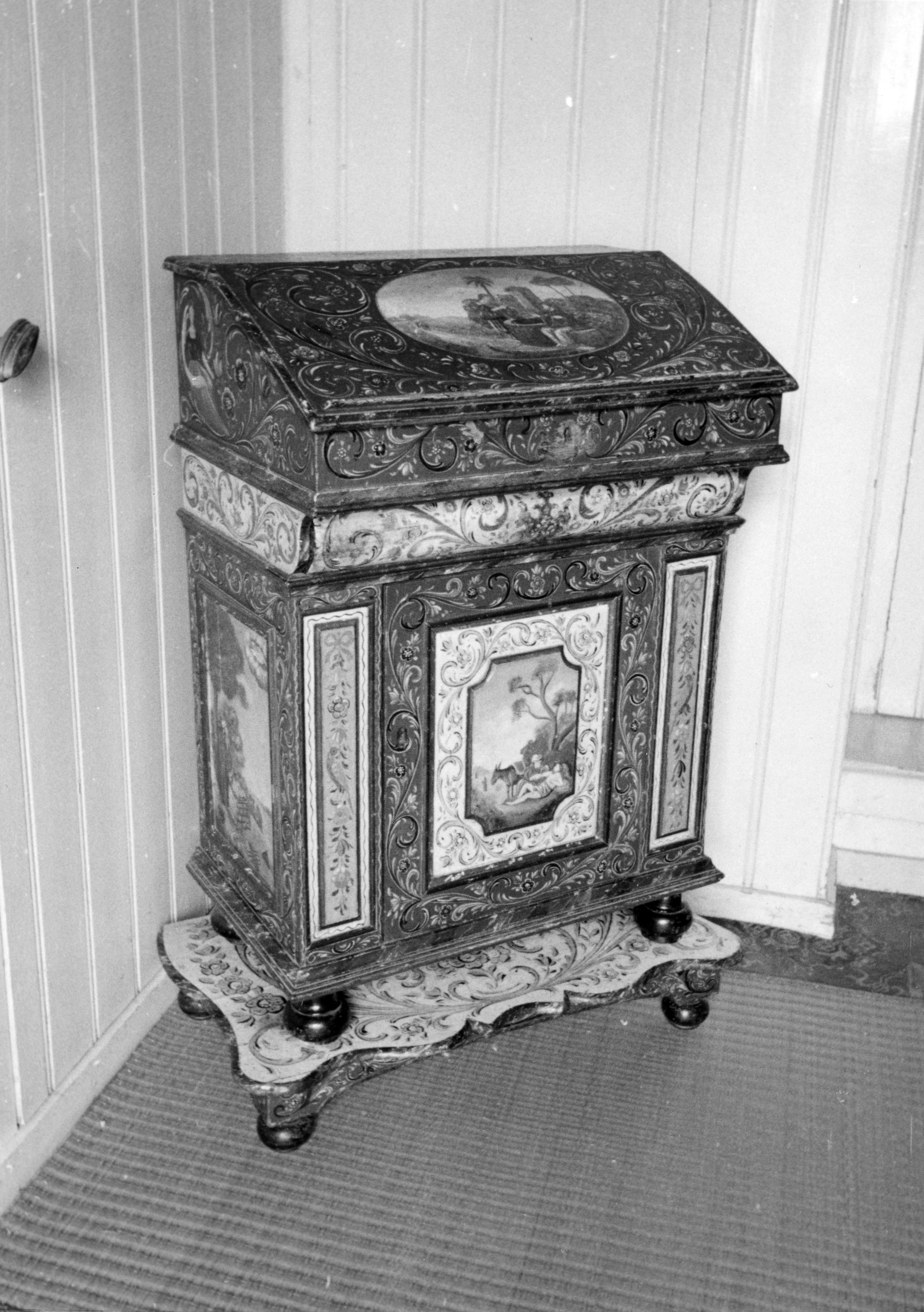 Bijbellessenaar met onderzet, beiden voorzien van Hindelooper schilderwerk. Op het deurtje staat een voorstelling van de Barmhartige Samaritaan. De lessenaar en onderzet zijn eigendom van een vrouw in Hindeloopen.