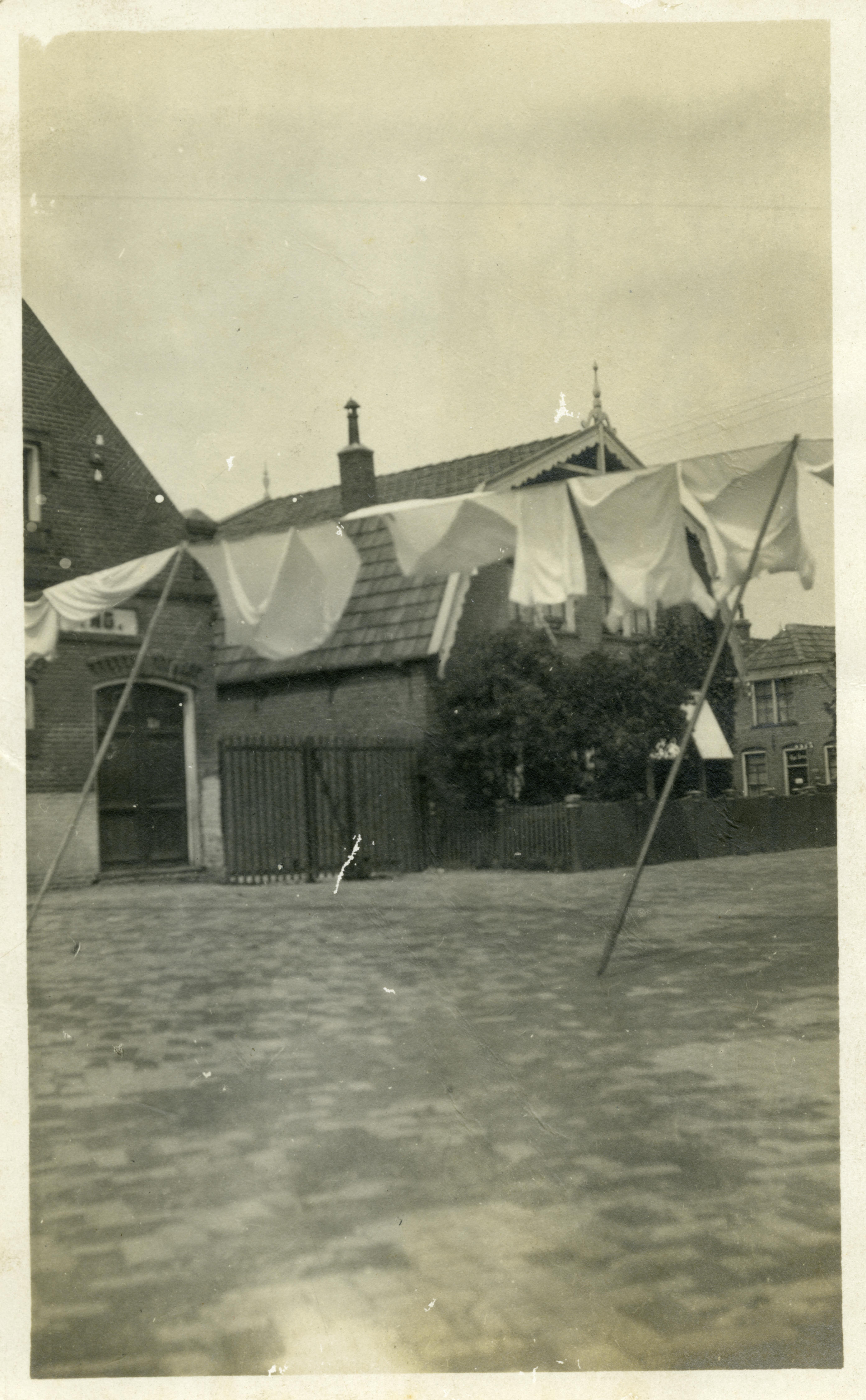 Straatbeeld op het eiland Urk. Over de straat is een waslijn gespannen. Het opschrift op de achterzijde luidt: 'De wasch te Urk [...] 1920'.