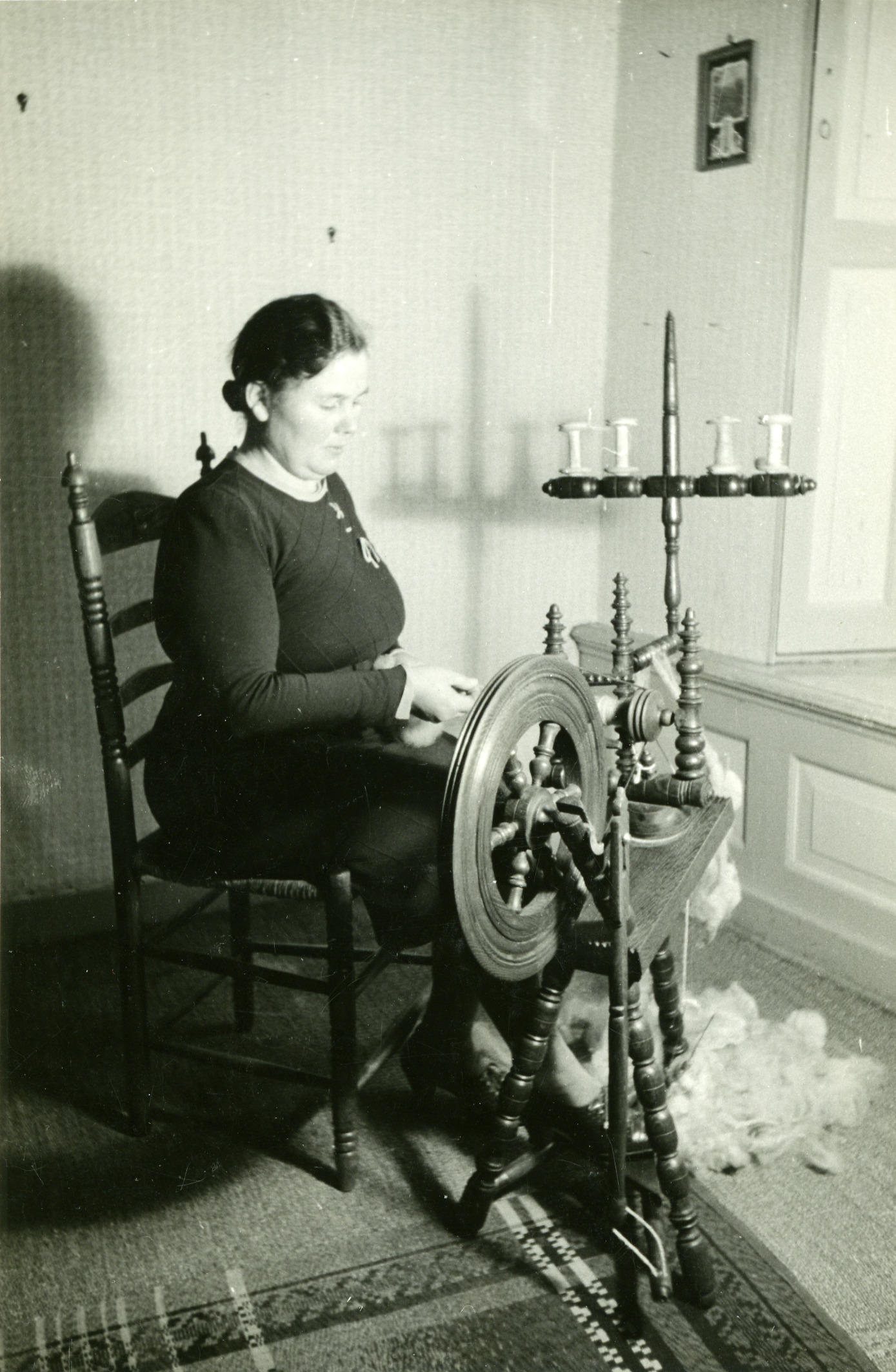 Bertha Stallinga, de vrouw van de burgemeester van Hindeloopen, demonstreert het spinnen van schapenwol.