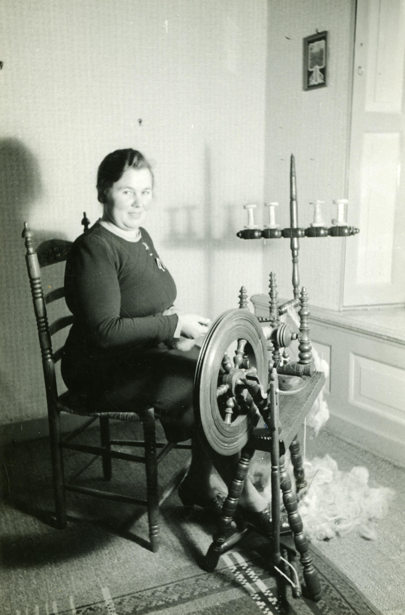 Bertha Stallinga, de vrouw van de burgemeester van Hindeloopen, demonstreert het spinnen van schapenwol.