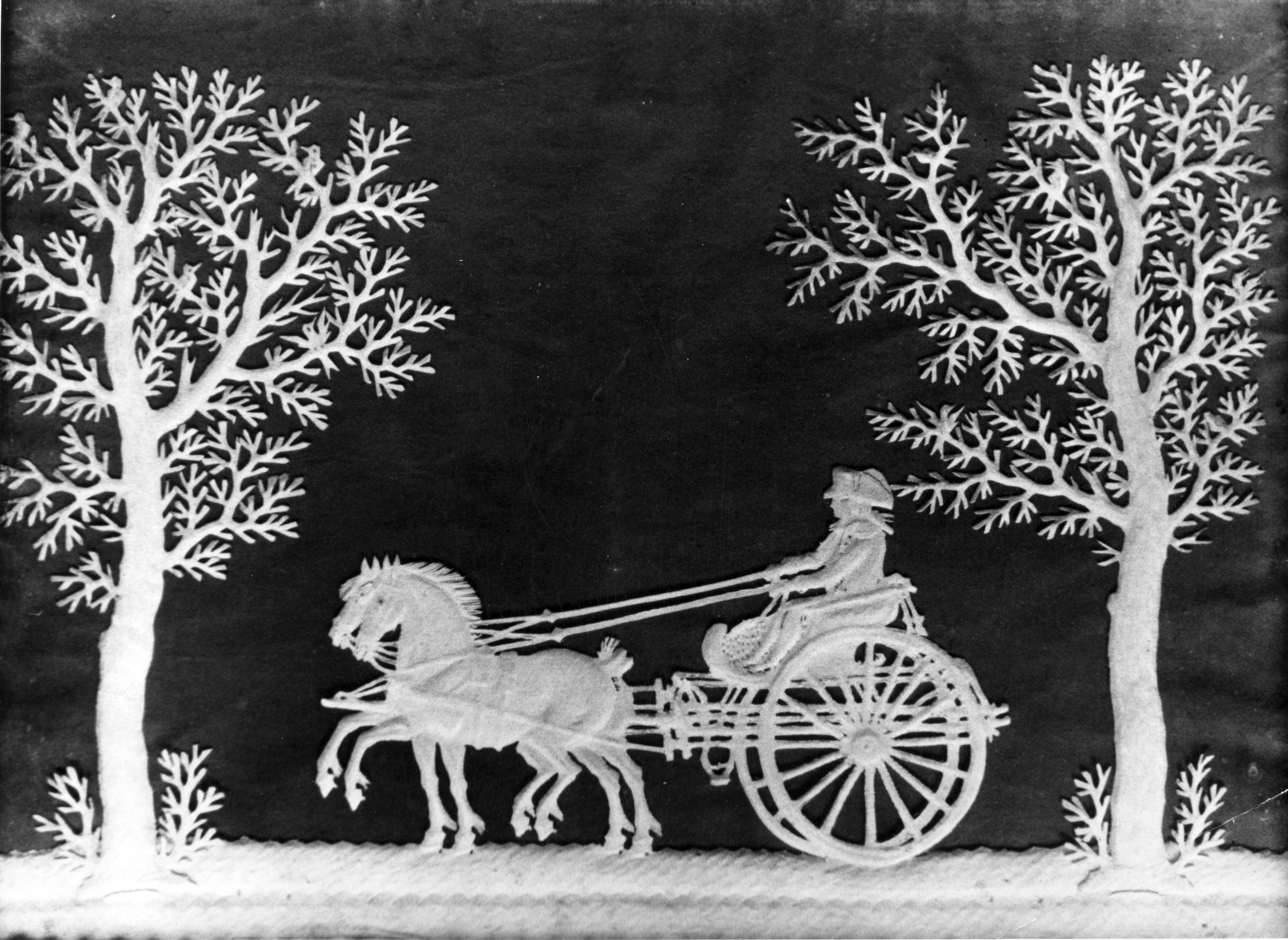Knipwerk met een voorstelling van een sjees, getrokken door twee paarden. Het knipwerk is eigendom van een familie in Hindeloopen.