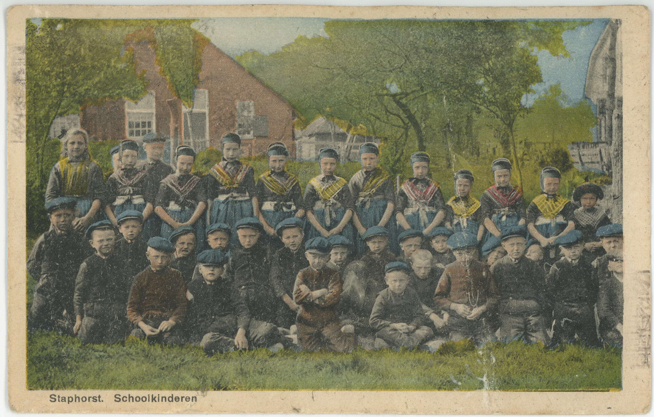 Ingekleurde ansichtkaart van schoolkinderen uit Staphorst.