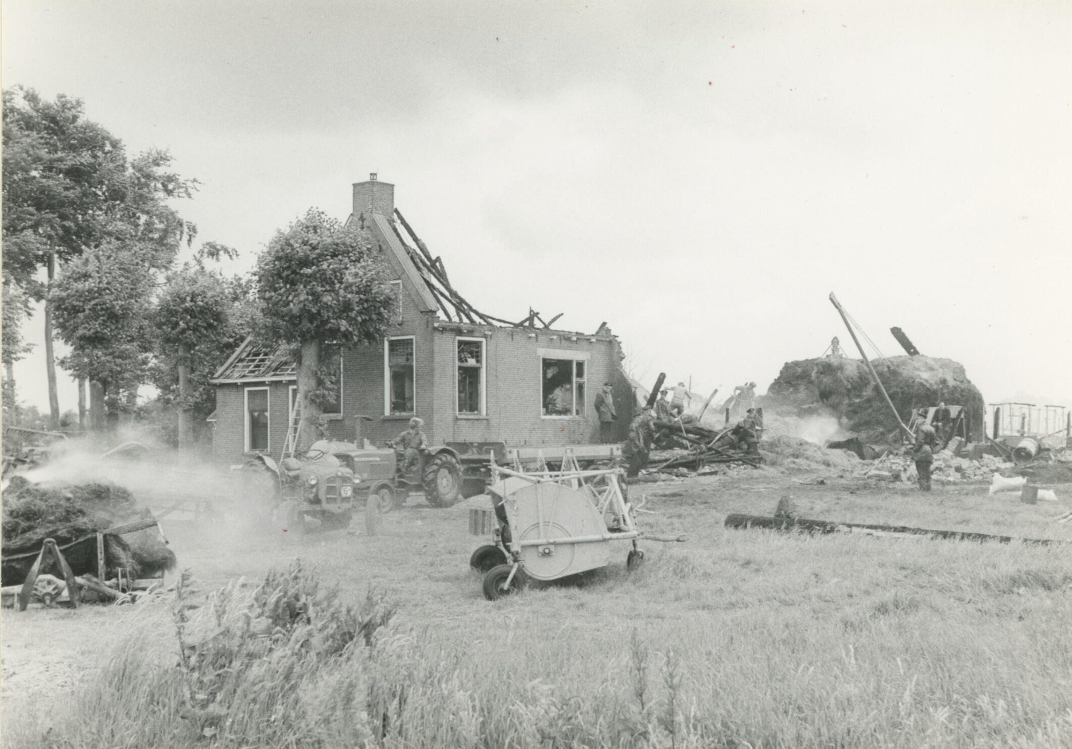 Verbrande boerderij in Oudehorne, gemeente Heerenveen. De boerderij is afgebrand op 1 juli 1965. Restanten hooi worden nog smeulend uit de hooiberg gehaald om elders op het land uit te branden.
