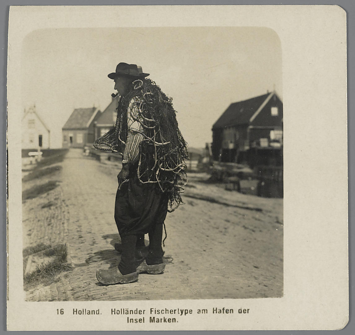 Twee mannen in Marker streekdracht. Vooraan staat een oudere man in zijn daagse werkdracht. Dit is Sijmon Peereboom. Op zijn rug draagt hij een visnet. Achter Sijmon staat een tweede man. Deze foto is de helft van een stereofoto.