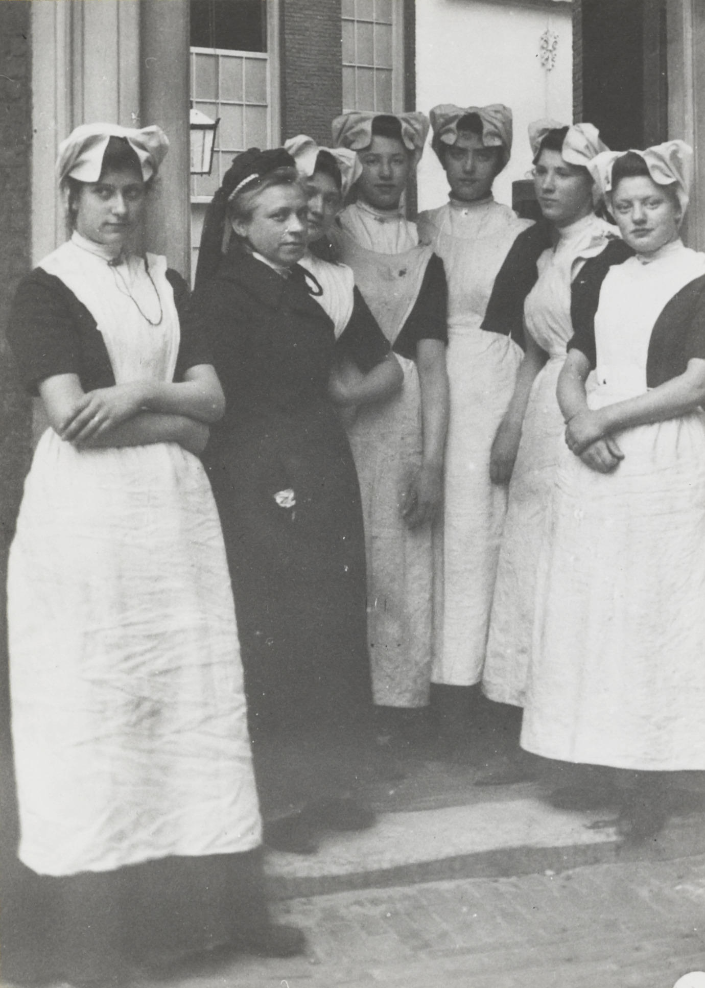 Weesmeisjes van het Burgerweeshuis in Amsterdam. De meisjes zijn gekleed in huisdracht.
