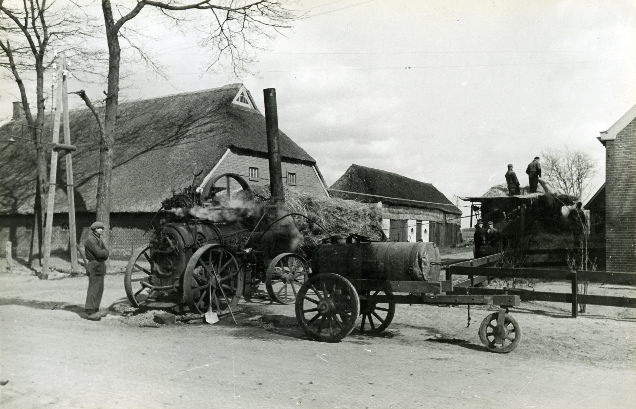 Dorsen van graan met een dorsmachine bij een boerderij in Zwiggelte. De dorsmachine wordt aangedreven door een stoomlocomobiel.