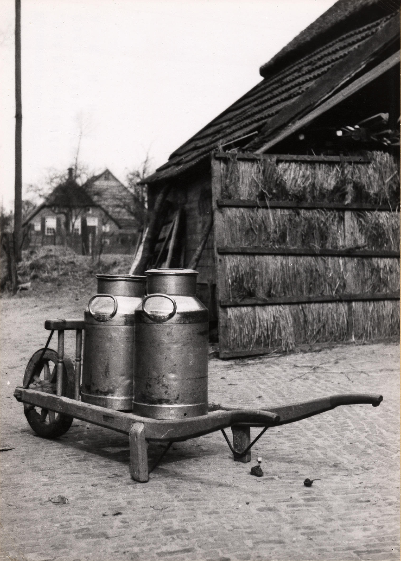 Houten spijlenkruiwagen voor het vervoer van melkbussen in Staphorst. Op de kruiwagen staan twee melkbussen. Links op de achtergrond staat een boerderij, rechts een schuur met pannendak. Tegen de schuur staat een scherm. Dit scherm van houten latten en stro of riet werd gebruikt om op het land onder te schuilen bij een regenbui en ...