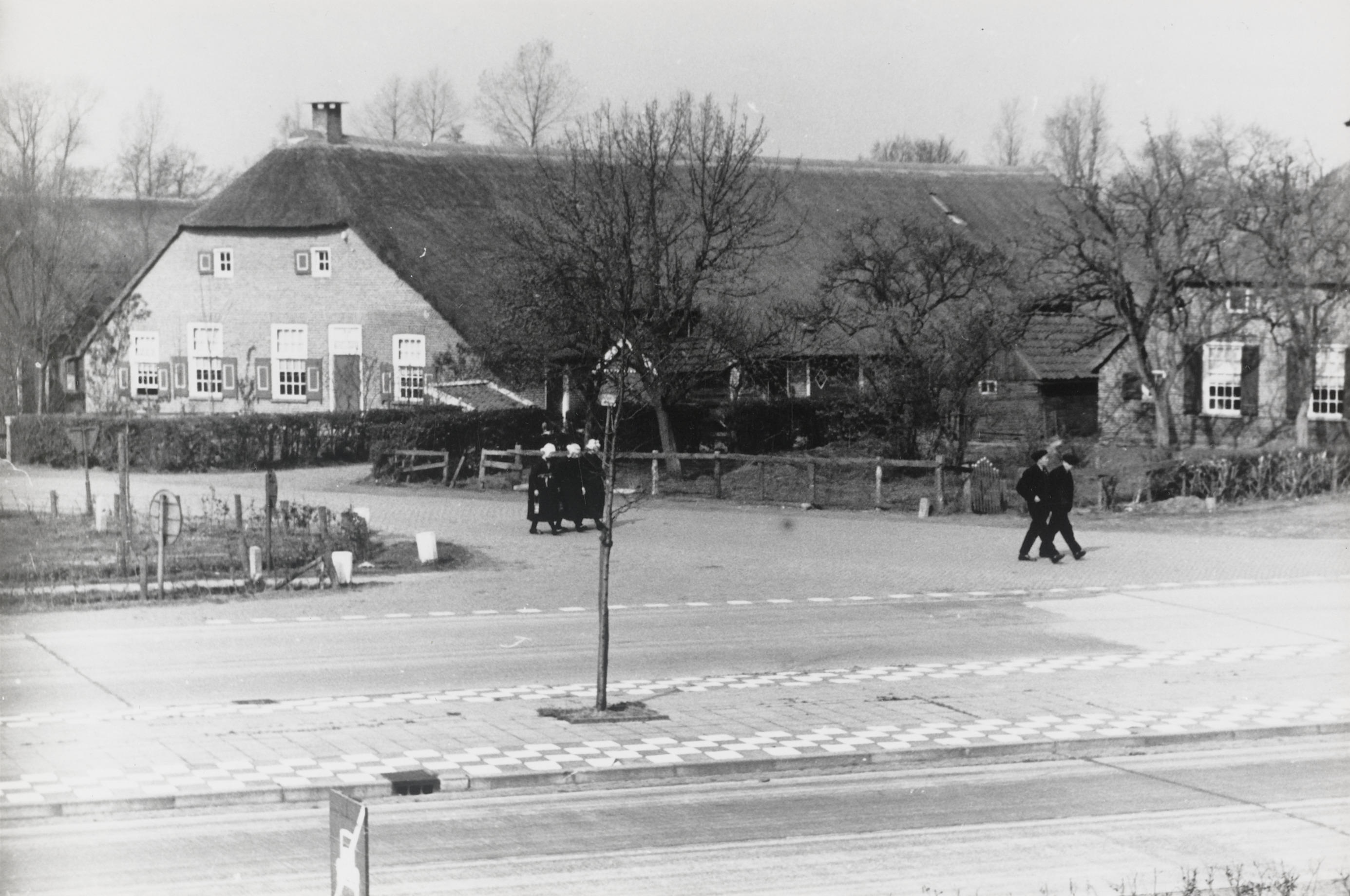 Kerkgangers ter hoogte van 'De Hoek', Staphorst, 1944 (zwart-wit foto)