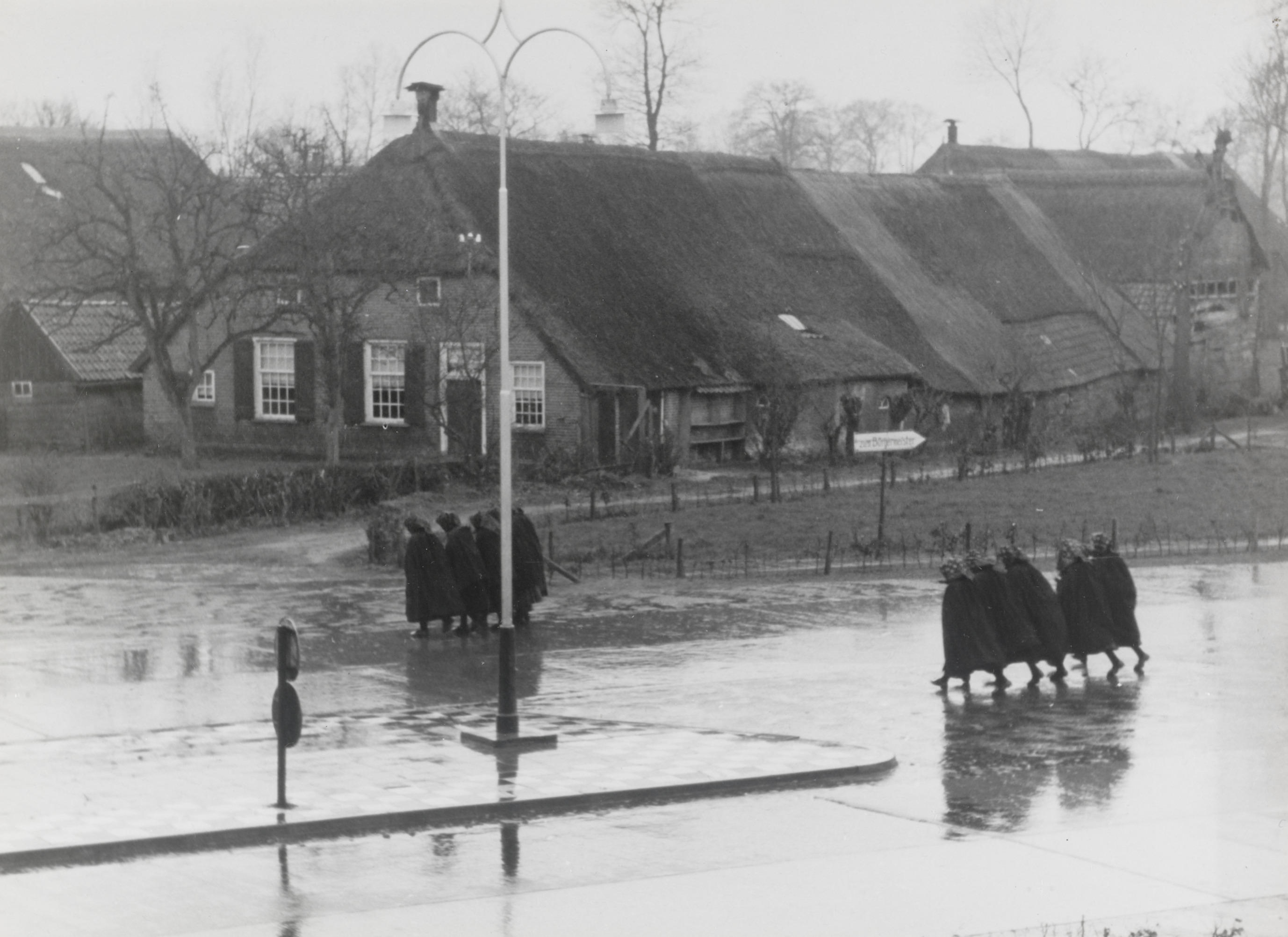 Kerkgangers ter hoogte van 'De Hoek', Staphorst, 1944 (zwart-wit foto)