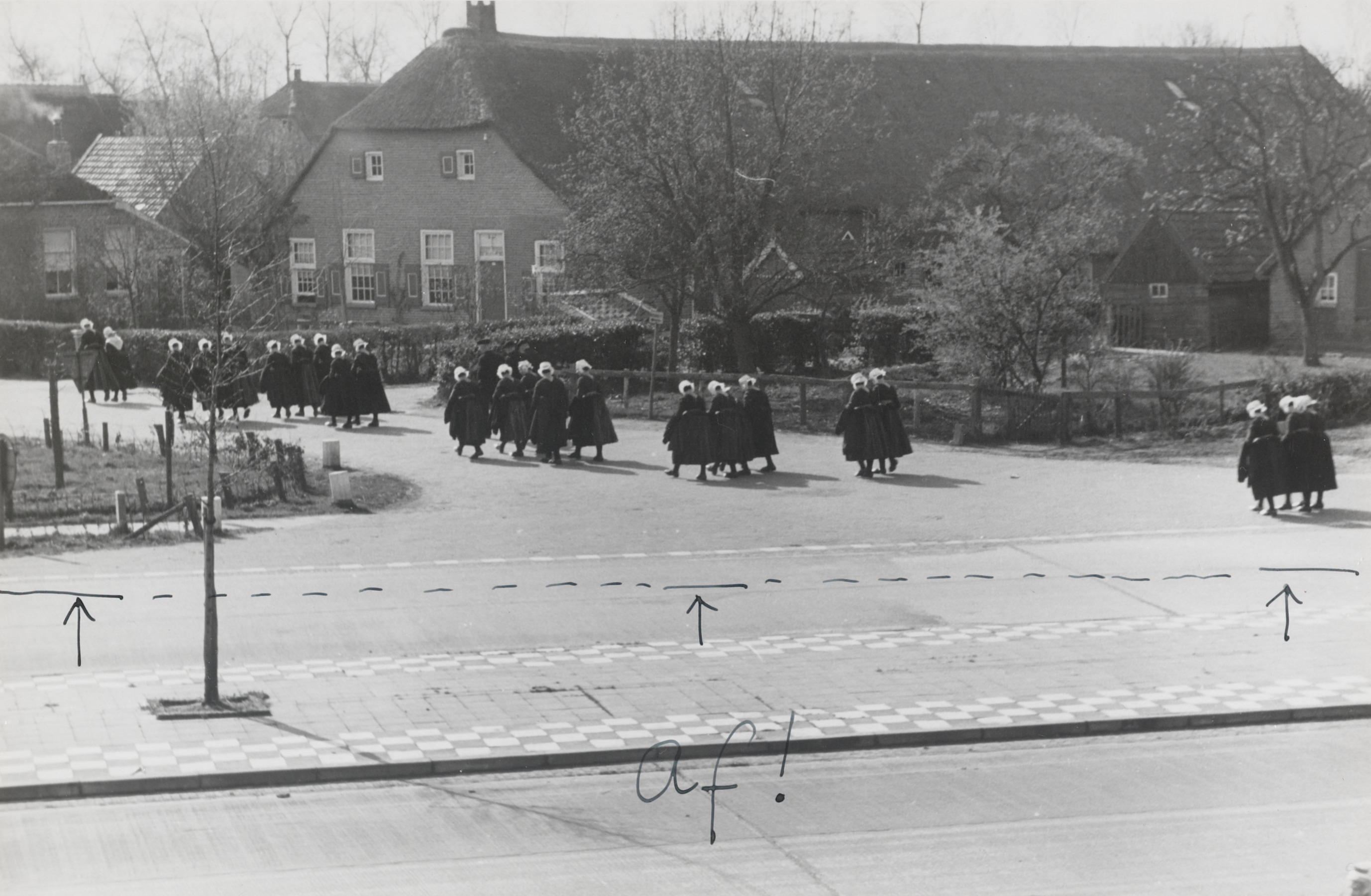 Kerkgangers ter hoogte van 'De Hoek', Staphorst, 1944 (zwart-wit foto)