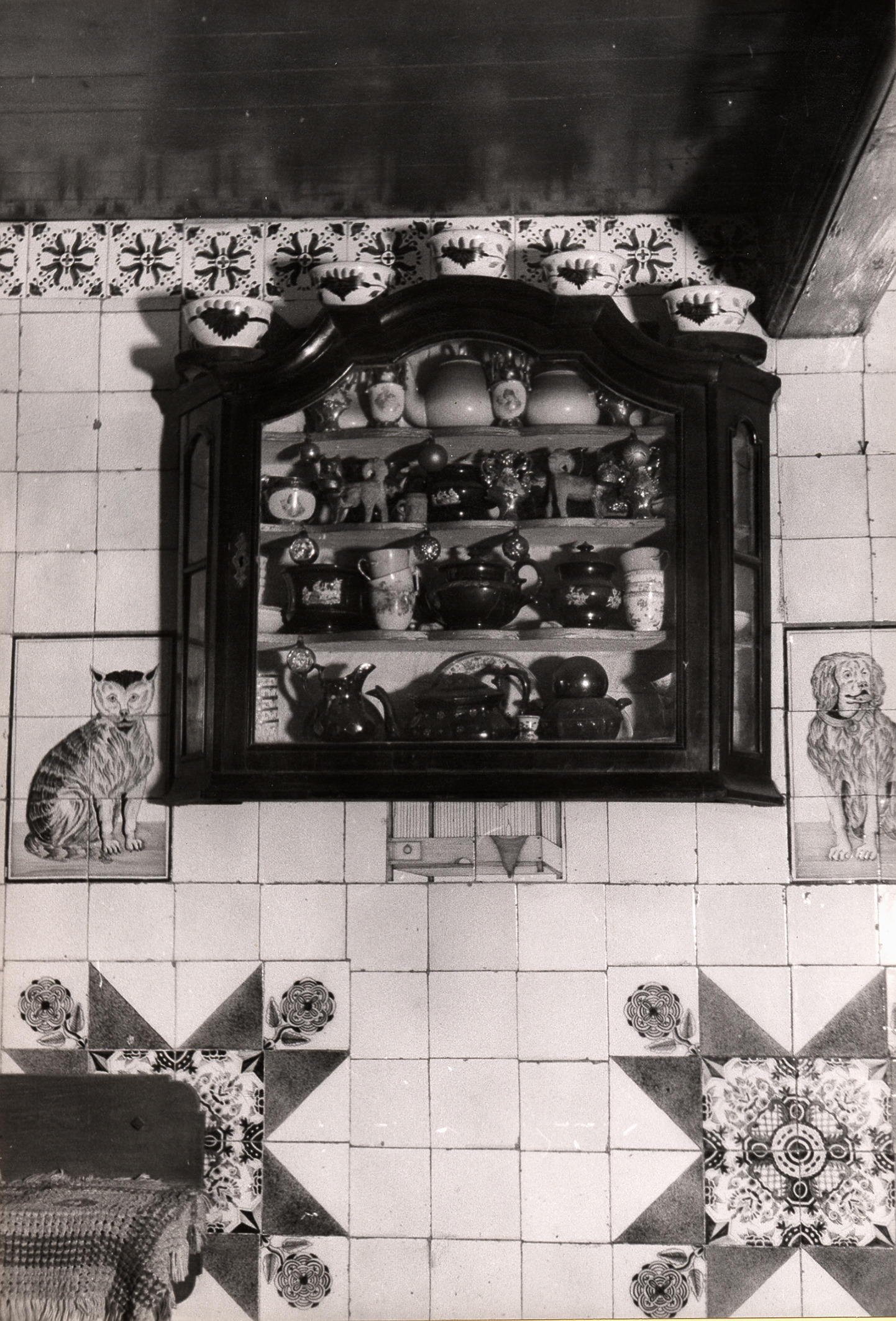Houten wandkastje met serviesgoed, Staphorst, 1944 (zwart-wit foto)