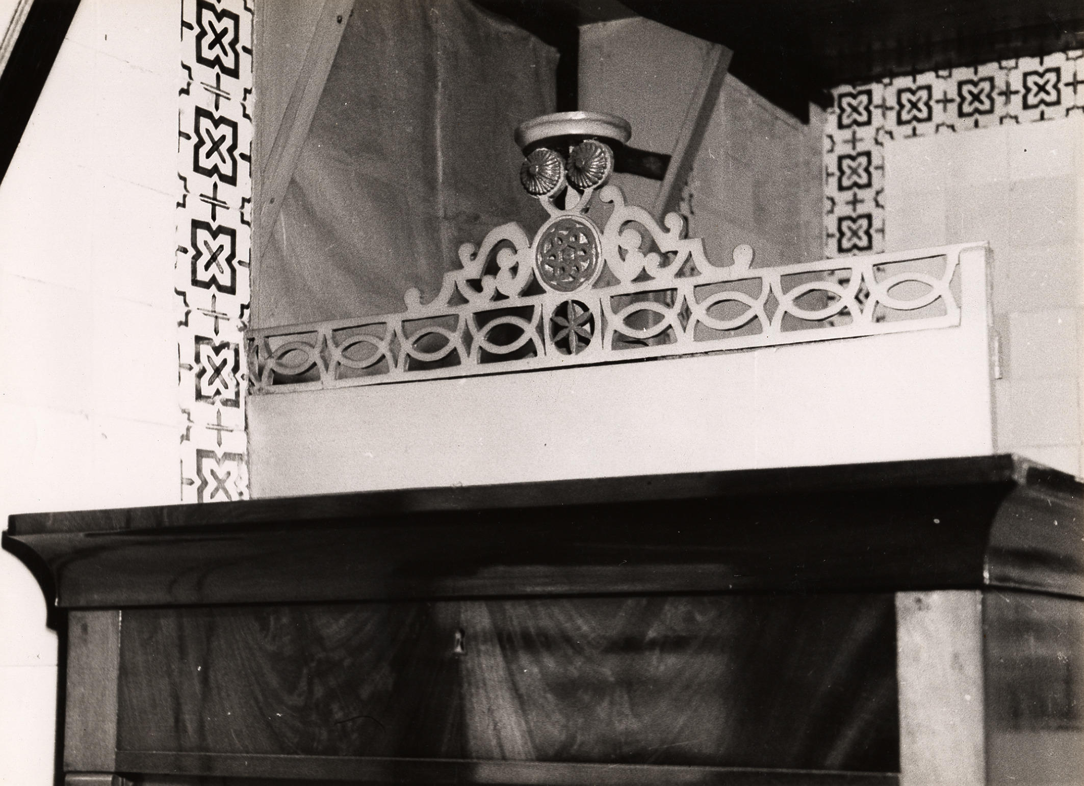Houten tochtscherm, beschilderd en versierd met figuurzaagwerk, in een woning in Staphorst. Het scherm staat achter een kast, haaks op de buitenmuur naast de buitendeur.