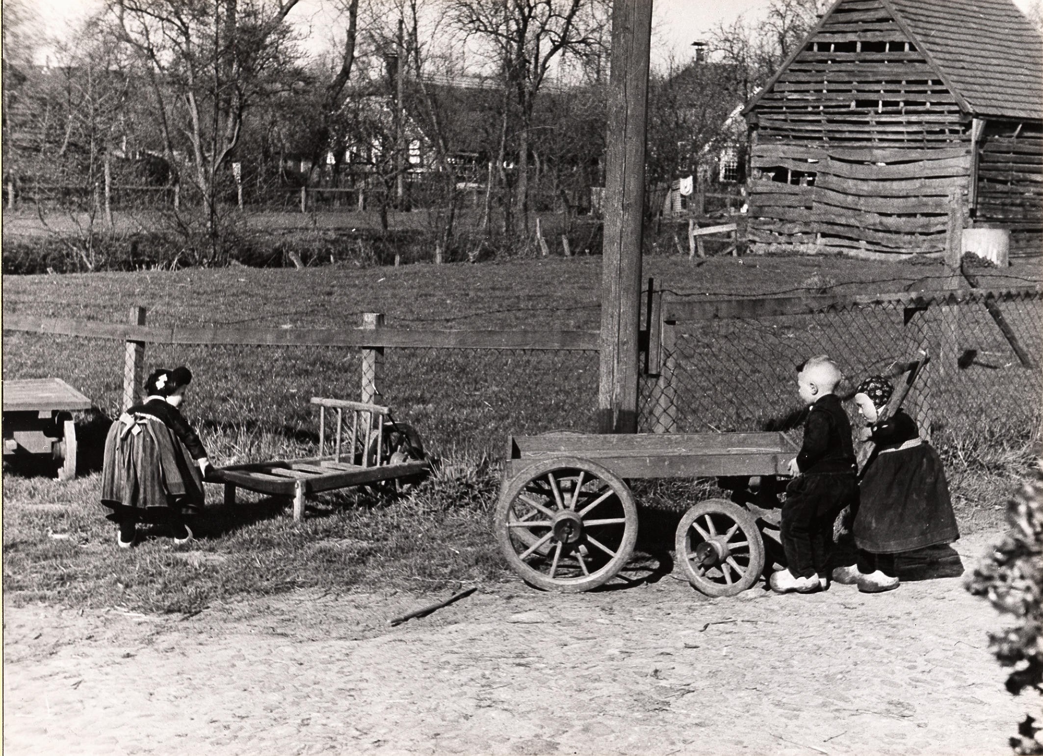 Kinderen met trekwagens in Staphorst. Links een vierwielig wagentje voor transport van melkbussen van en naar de weg. Rechts daarvan een meisje in winterdracht met een kruiwagen voor melkbussenvervoer. Het meisje draagt op haar hoofd de 'nette' (muts) met zilveren haak. Ze draagt een gestreepte bovenrok, katoenen schort en een winterjak, het 'buisje'. Rechts twee ...