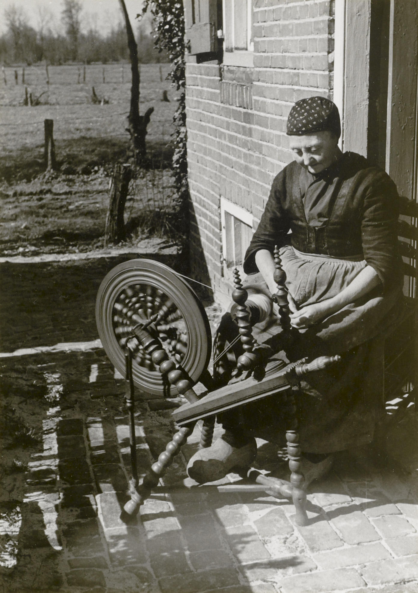 Jentje Dunnink-de Weerd aan het spinnen. Jentje zit voor de deuropening van haar woning in Staphorst. Ze draagt een gedessineerde muts, een daags winterjak met korte mouwen en daaronder een schouderdoek, rok, schort en klompen. Met haar rechtervoet houdt ze het spinnewiel in beweging.
