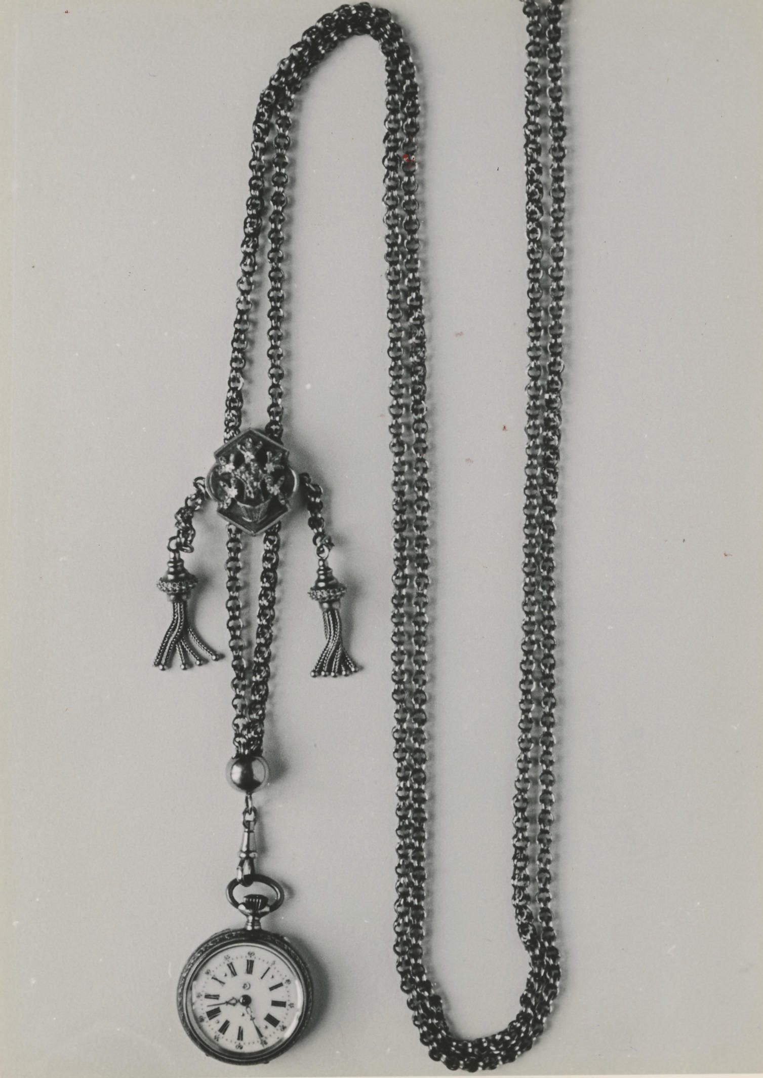 Gouden schuifketting met een horloge, gedragen door een vrouw in streekdracht uit de omgeving van Sevenum. Het geheel is eigendom van een familie uit De Hees.