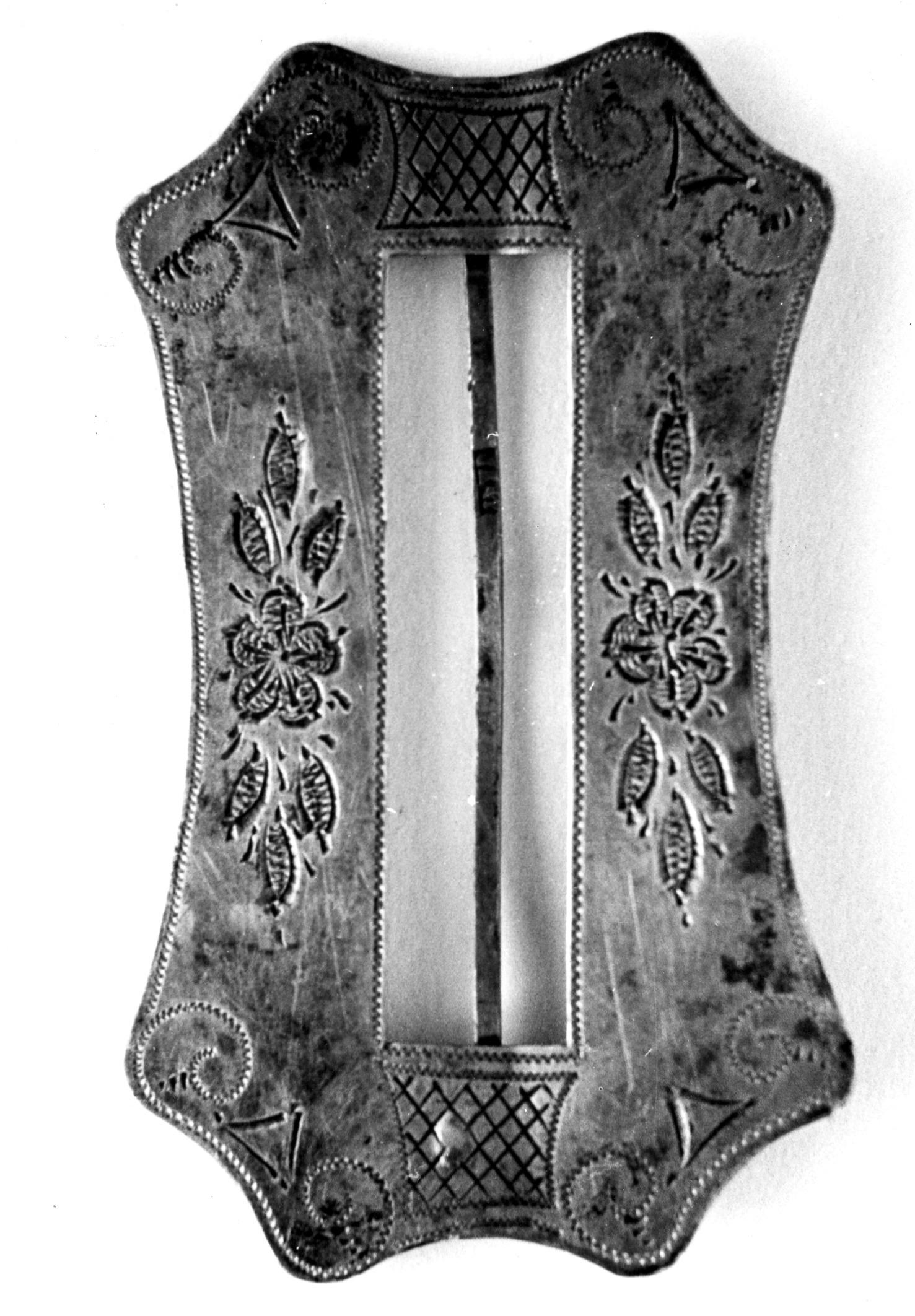 Zilveren ceintuurgesp met gegraveerde versiering uit circa 1880. De gesp is gedragen bij het zogenoemde kleedje (japon), door een vrouw in streekdracht op Terschelling. Hij is eigendom van een familie in Striep.