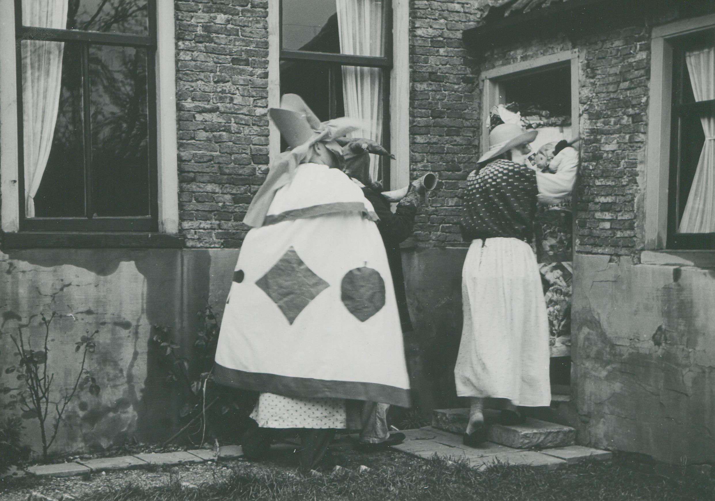 Foto waarop vier zogenoemde Sund(e)rums te zien zijn. Bij de Sunderumviering (jaarlijks op 6 december) op Terschelling verkleden de volwassen mannen zich en gaan 's avonds, wanneer het donker is, de huizen langs. Het is de bedoeling dat zij door niemand herkend worden. Deze foto is overdag gemaakt en de situatie is geënsceneerd om de ...