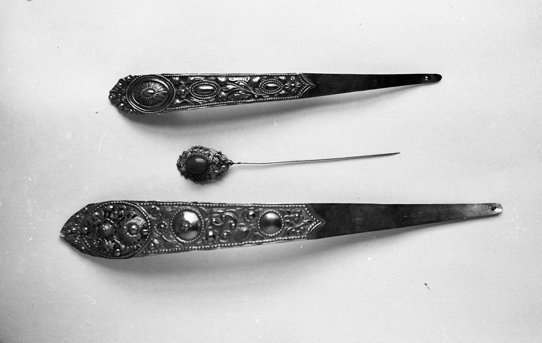 Gouden voorhoofdsnaald, gouden kapspeld met bloedkoraal en gouden zijnaald, gedragen door een vrouw in streekdracht op Terschelling. De voorhoofdsnaald is gemaakt in 1853, de zijnaald in 1874 en de kapspeld rond 1880. Ze zijn eigendom van een vrouw in Hoorn.