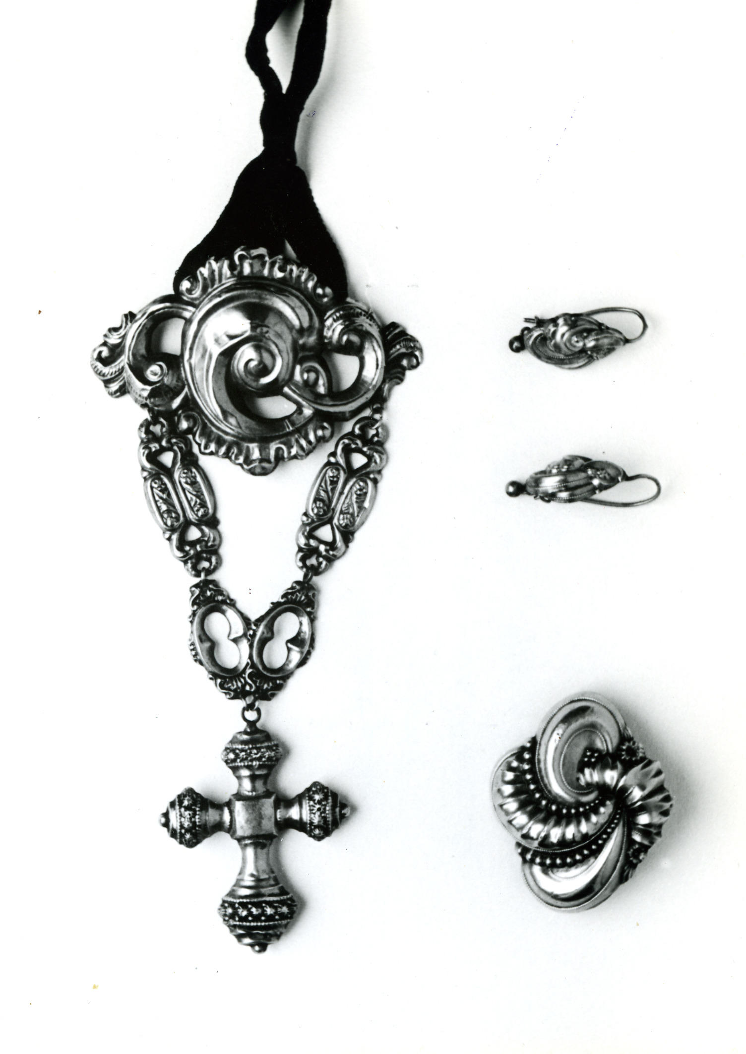 Set streeksieraden, bestaande uit een gouden broche, een paar gouden oorbellen en een borsthanger met een gouden plaat en gouden kruis. De sieraden zijn gemaakt rond 1895 en gedragen bij de streekdracht van Stein. Ze zijn eigendom van een familie in Stein.