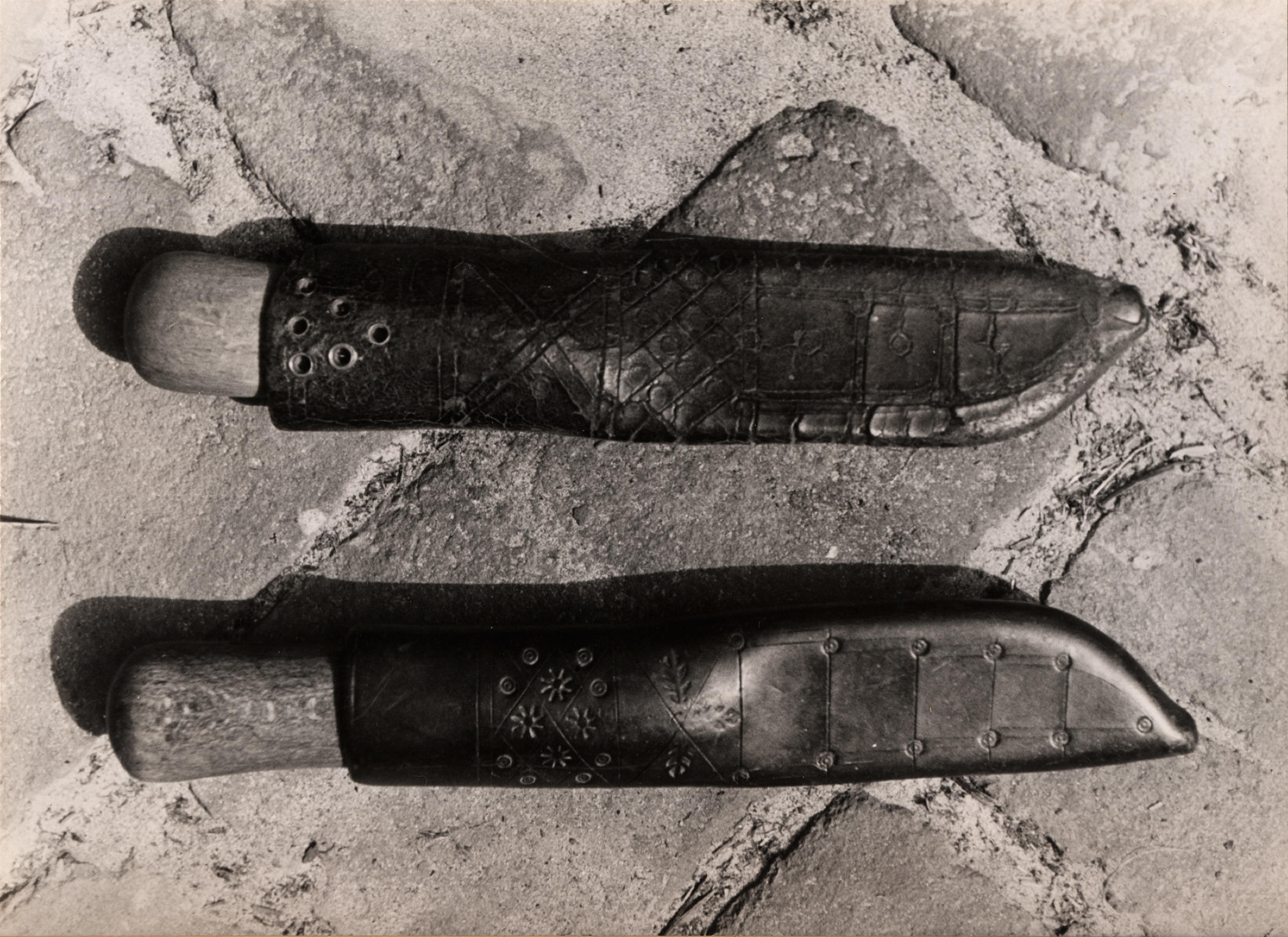 Twee leren messcheden met snijwerk, Staphorst, 1944 (zwart-wit foto)