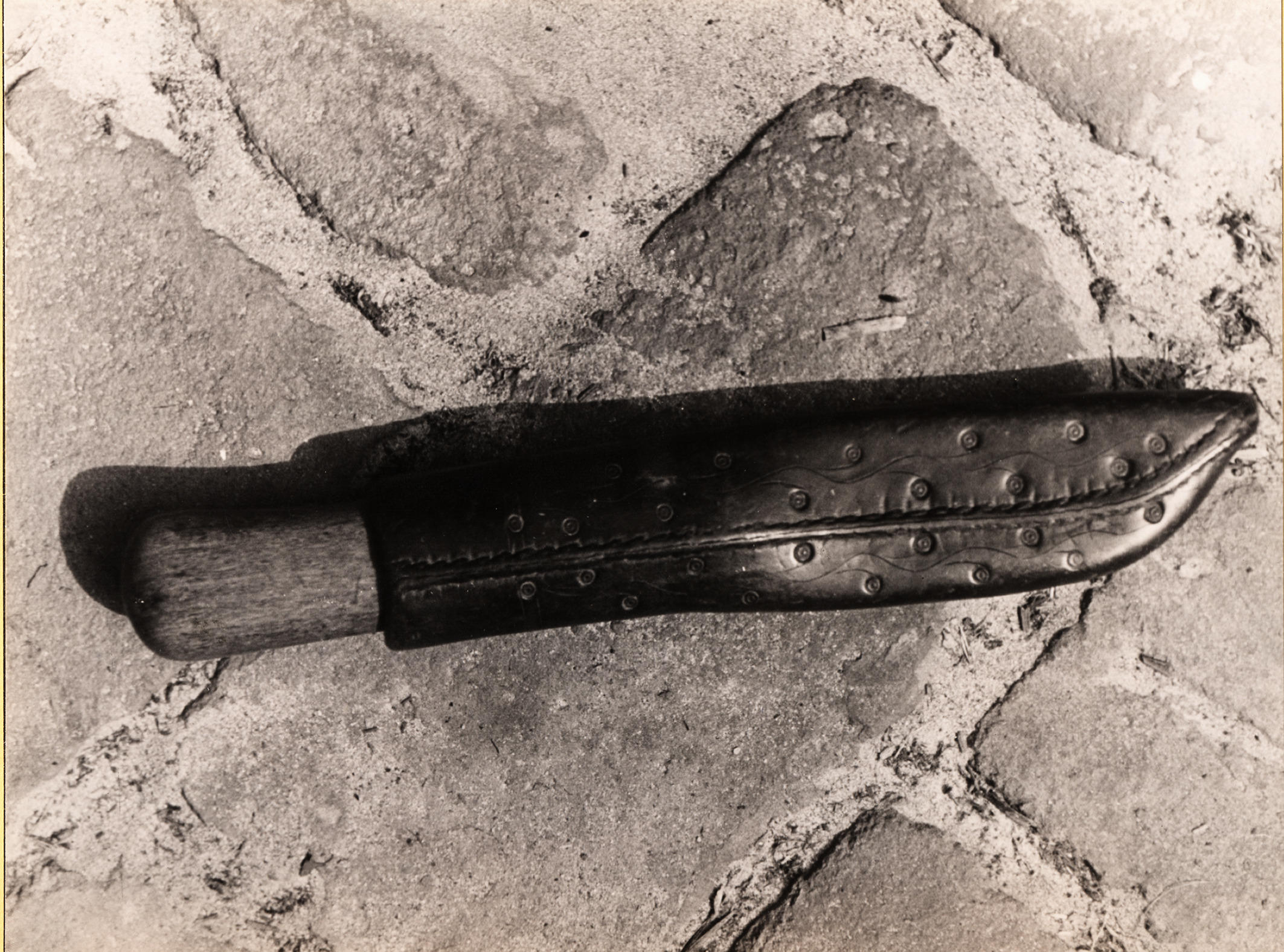 Leren messchede met snijwerk, Staphorst, 1944 (zwart-wit foto)