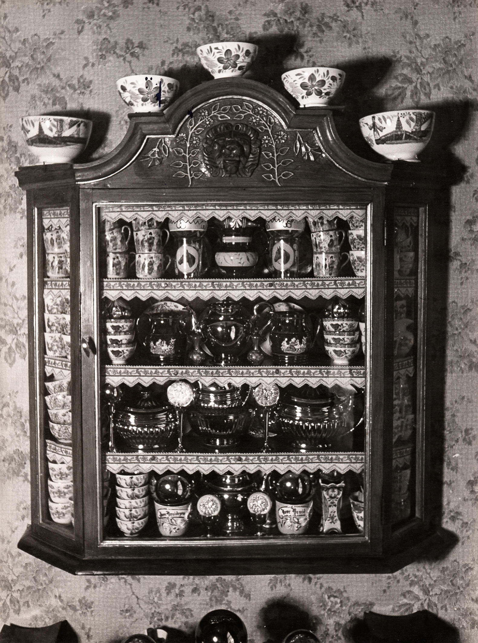 Vitrinekastje met serviesgoed, Staphorst, 1944 (zwart-wit foto)