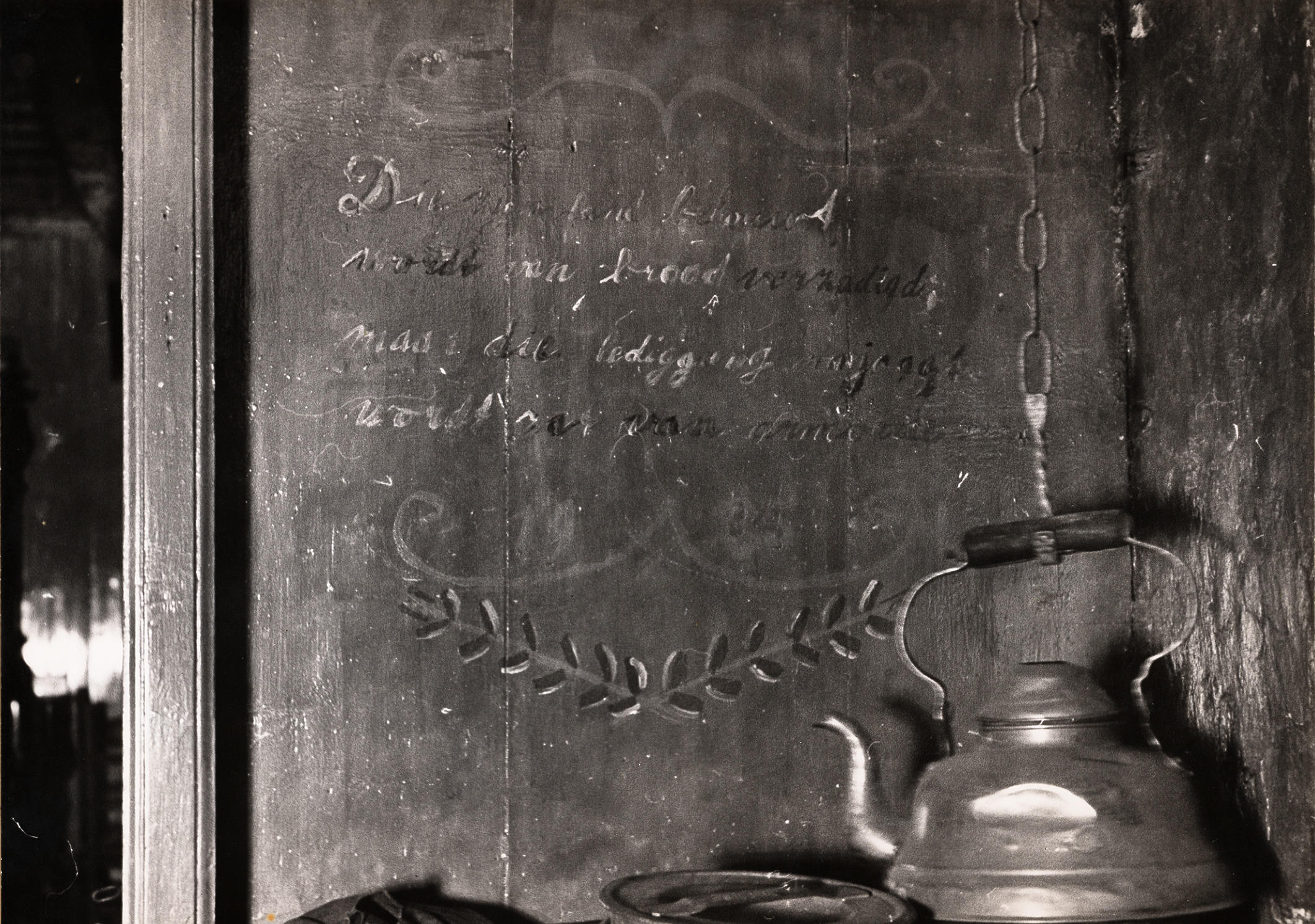 Wandbeschildering met de spreuk 'Die zijn land bebouwd word van brood verzadigd, maar die lediggang najaagt wordt zat van armoede' in een woning in Staphorst. Rechts hangt een waterketel aan een haalketting.