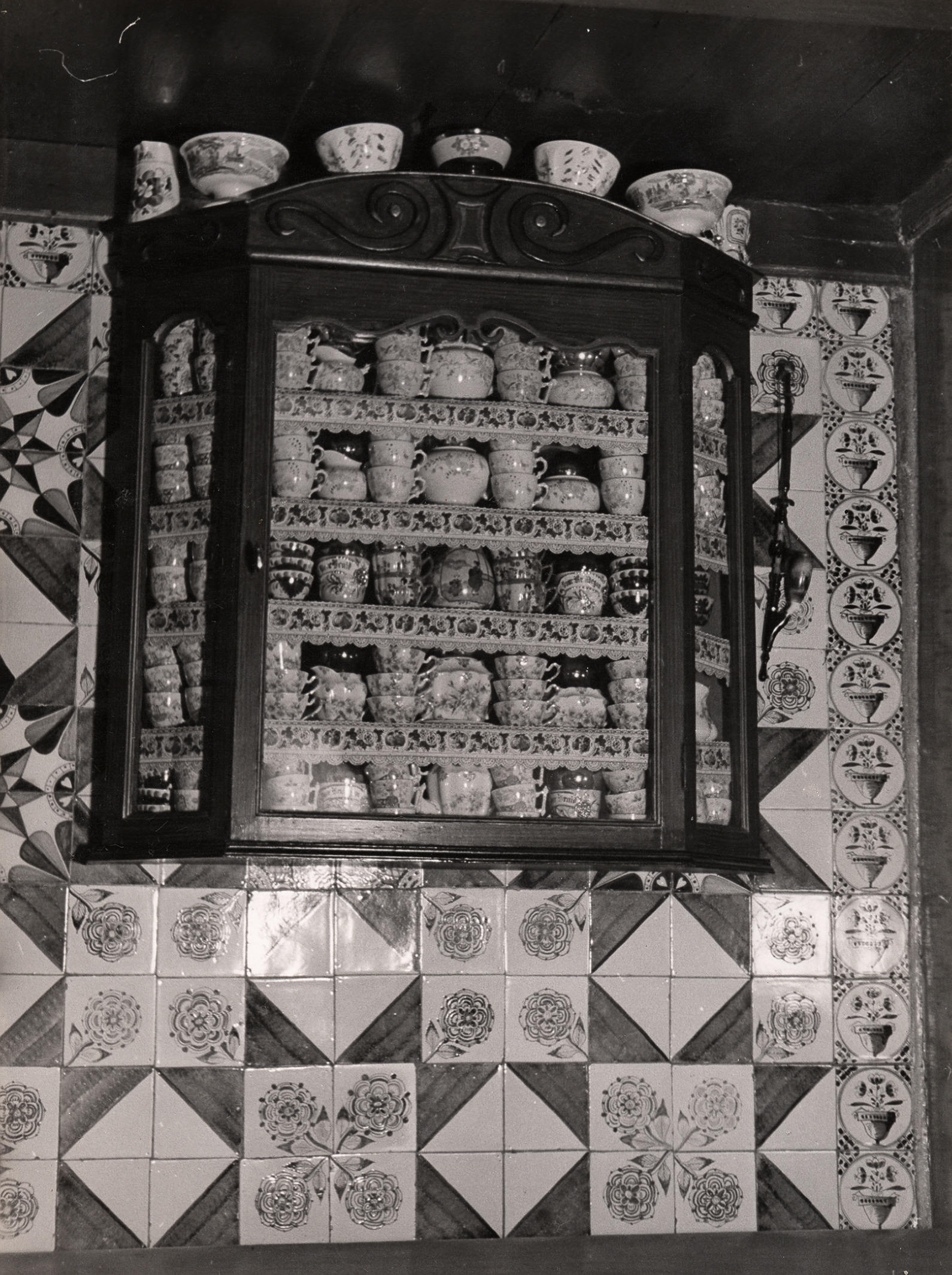 Vitrinekastje met serviesgoed, Staphorst, 1944 (zwart-wit foto)