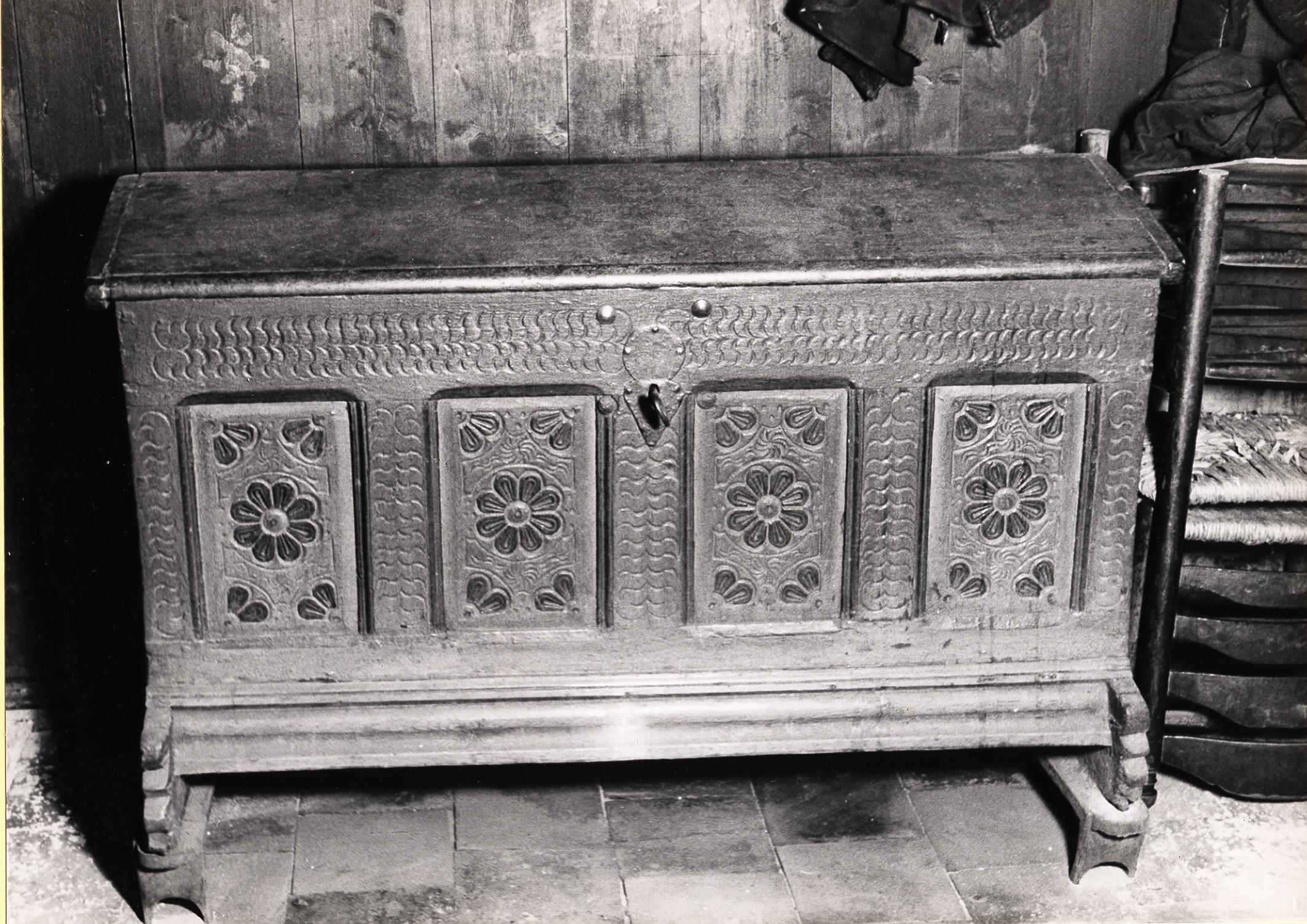 Houten kist met snijwerk, Rouveen, 1944 (zwart-wit foto)