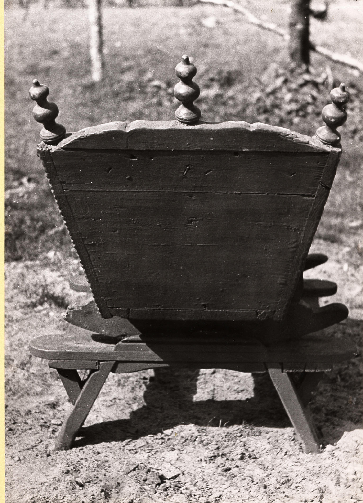 Achterzijde van een houten schommelwieg, Staphorst, 1944 (zwart-wit foto)