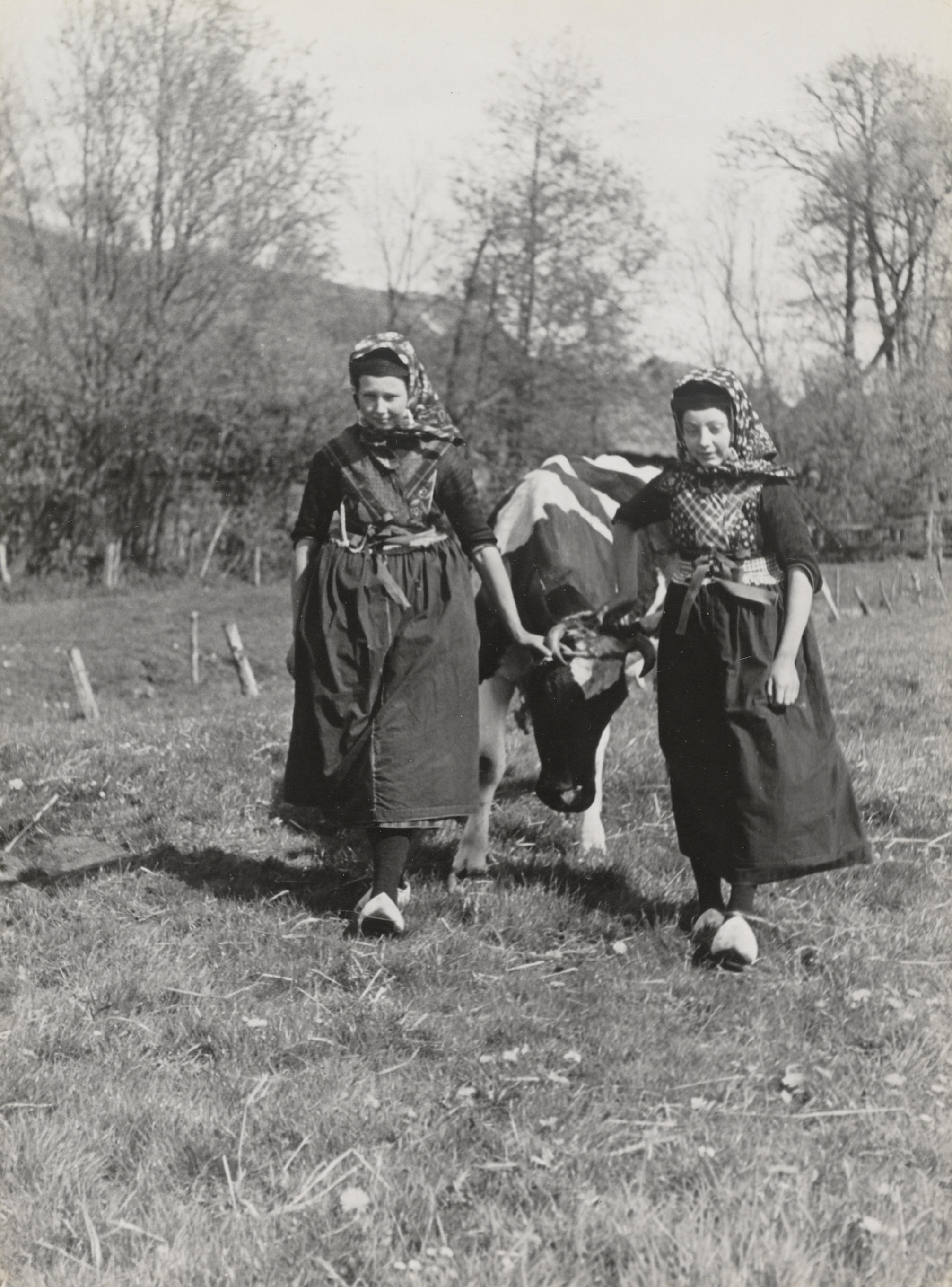 Grietje Troost en Geertje Hoeve in Staphorster streekdracht, met een koe. Grietje draagt een zilveren ketting met zakhorloge. Dit horloge werd alleen doordeweeks gedragen. Het zat op een opgenaaid zakje op de borstrok onder de kraplap. Het uiteinde van de ketting werd vastgemaakt aan een op de borstrok genaaid oog of aan een sluitband van ...