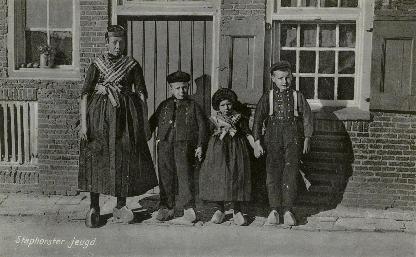 Ansichtkaart met een foto van Lijsje, Albert, Hendrikje en Jan Hoeve, gekleed in Staphorster streekdracht. De kinderen staan voor de woning van de familie Hoeve in Staphorst.