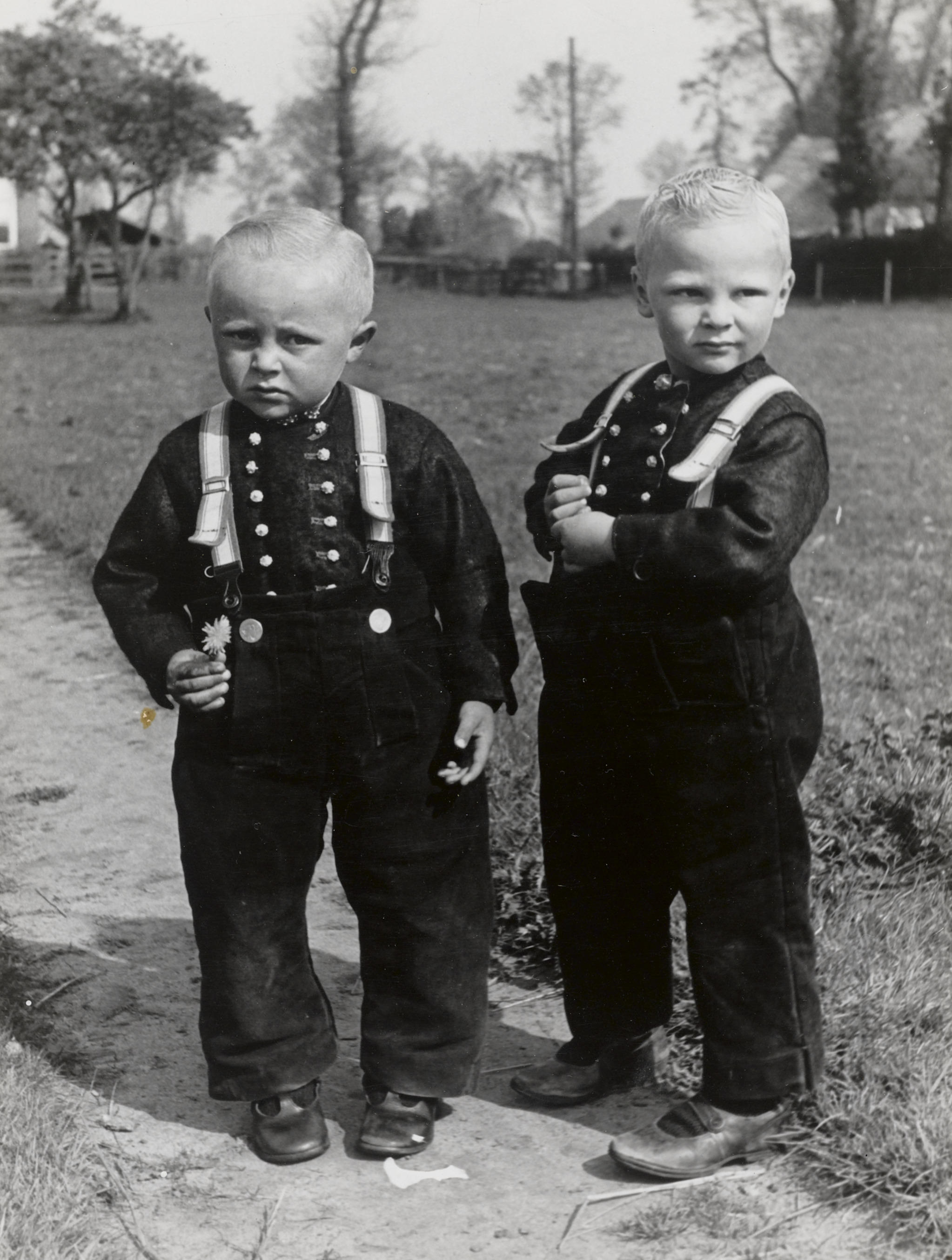 Jan Bloemhof en Jan Kooiker in Staphorster dracht, 1944 (zwart-wit foto)