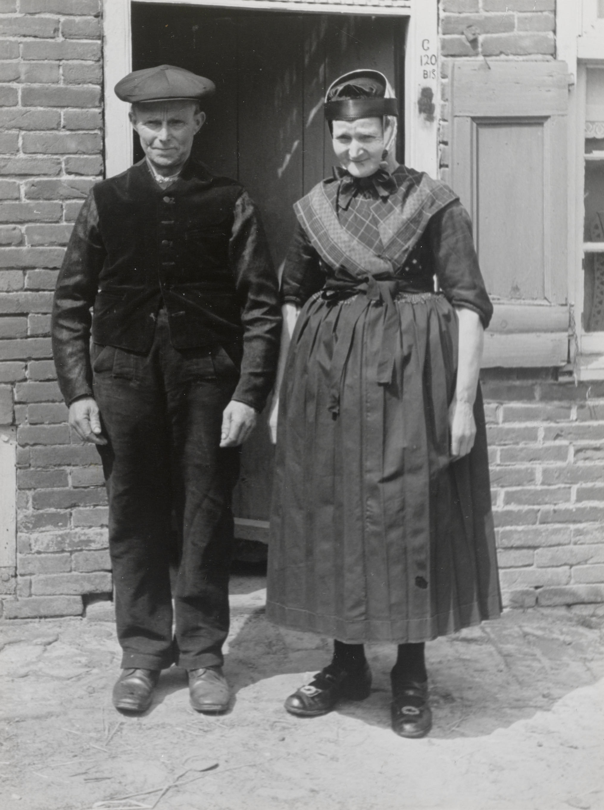 Echtpaar De Lange-Smit in opknapdracht, Staphorst, 1944 (zwart-wit foto)