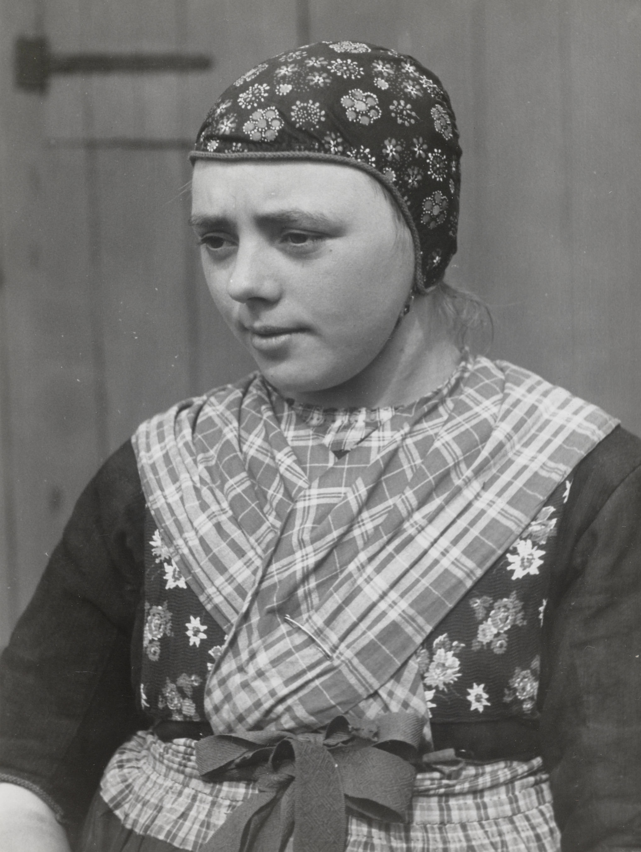 Beertje Veijer in daagse dracht, Rouveen, 1944 (zwart-wit foto)