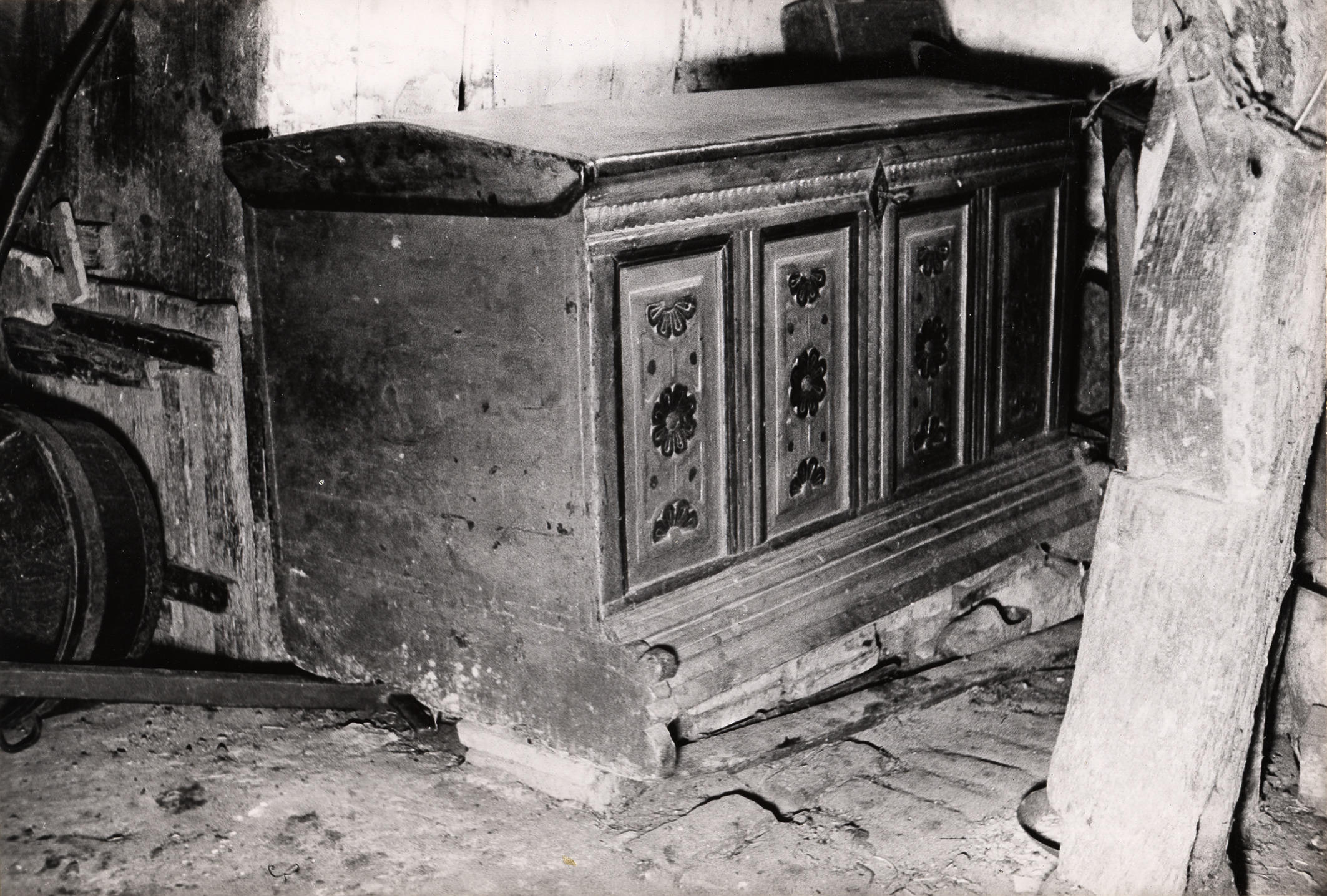 Houten kist met snijwerk, Rouveen, 1944 (zwart-wit foto)